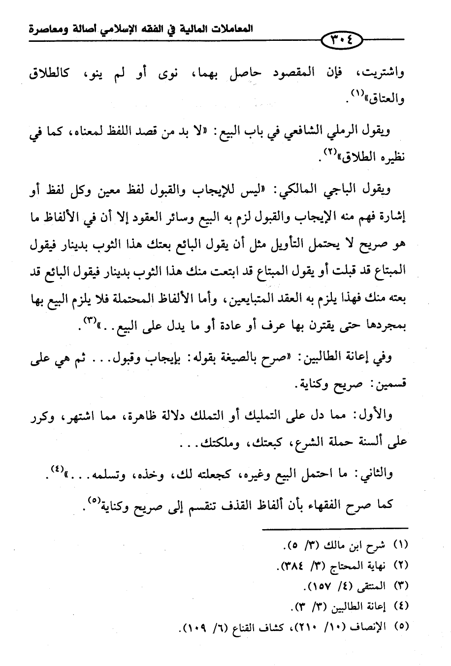ويقول الباجي المالكي: "ليس للإيجاب والقبول لفظ معين وكل لفظ أو إشارة فهم منه الإيجاب والقبول لزم به البيع وسائر العقود إلا أن في الألفاظ ما هو صريح لا يحتمل التأويل مثل أن يقول البائع بعتك هذا الثوب بدينار فيقول المبتاع قد قبلت أو يقول المبتاع قد ابتعت منك هذا الثوب بدينار فيقول البائع قد بعته منك فهذا يلزم به العقد المتبايعين، وأما الألفاظ المحتملة فلا يلزم البيع بها بمجردها حتى يقترن بها عرف أو عادة أو ما يدل على البيع .. " (¬٣).