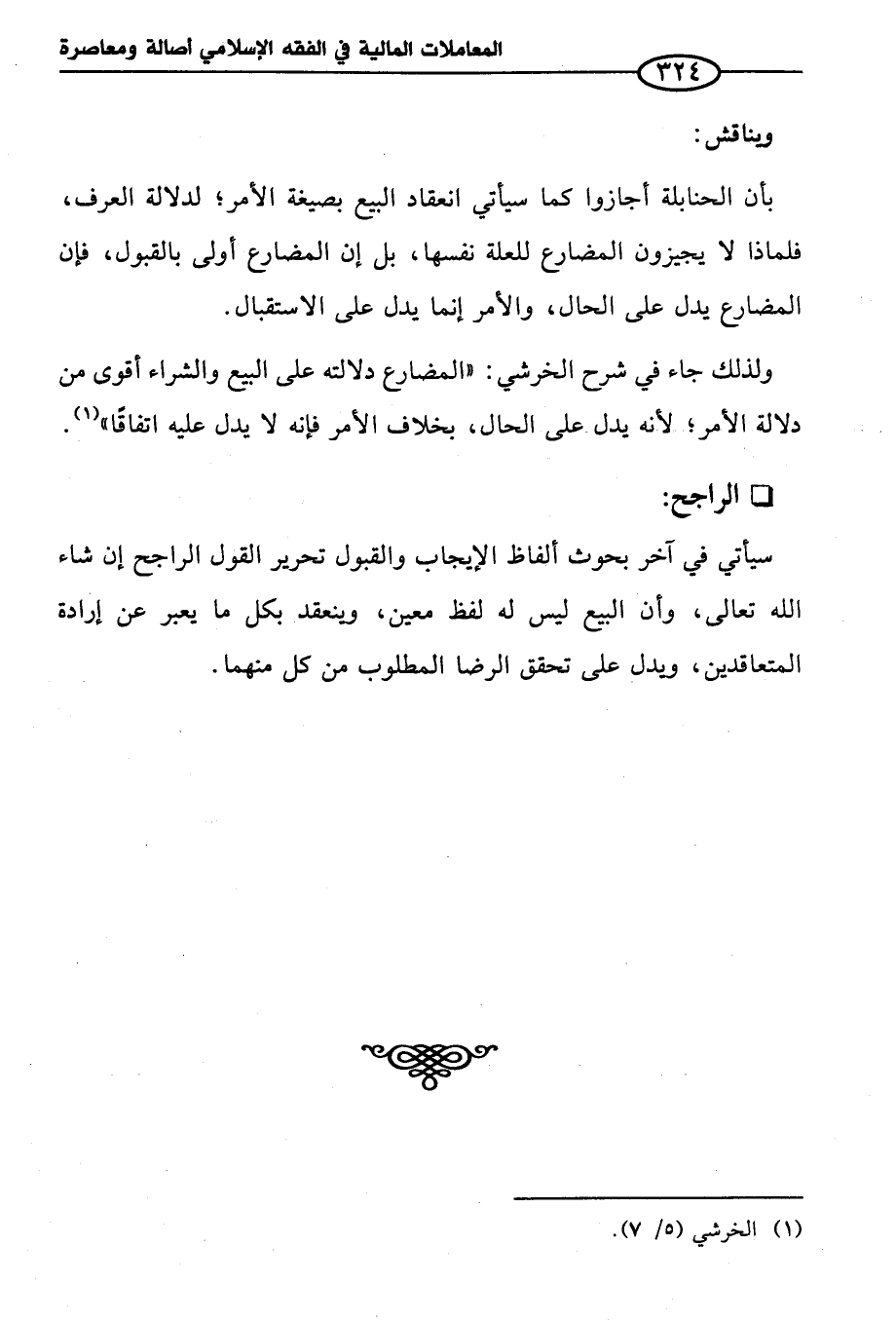 ولذلك جاء في شرح الخرشي: "المضارع دلالته على البيع والشراء أقوى من دلالة الآمر؛ لأنه يدل على الحال، بخلاف الأمر فإنه لا يدل عليه اتفاقًا" (¬١).