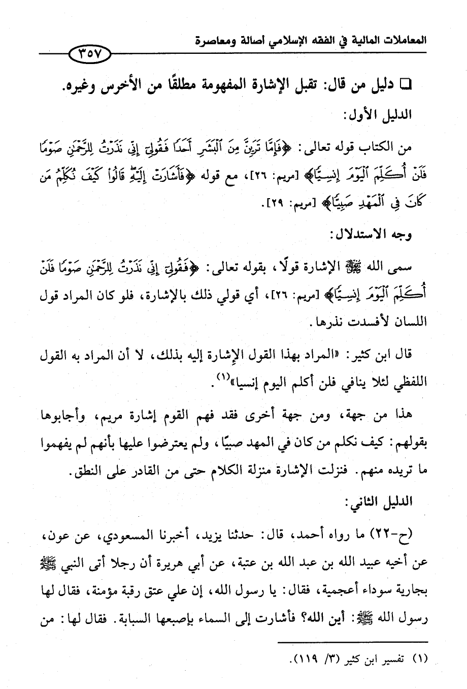 من الكتاب قوله تعالى: {فَإِمَّا تَرَيِنَّ مِنَ الْبَشَرِ أَحَدًا فَقُولِي إِنِّي نَذَرْتُ لِلرَّحْمَنِ صَوْمًا فَلَنْ أُكَلِّمَ الْيَوْمَ إِنْسِيًّا} [مريم: ٢٦]، مع قوله {فَأَشَارَتْ إِلَيْهِ قَالُوا كَيْفَ نُكَلِّمُ مَنْ كَانَ فِي الْمَهْدِ صَبِيًّا} [مريم: ٢٩].