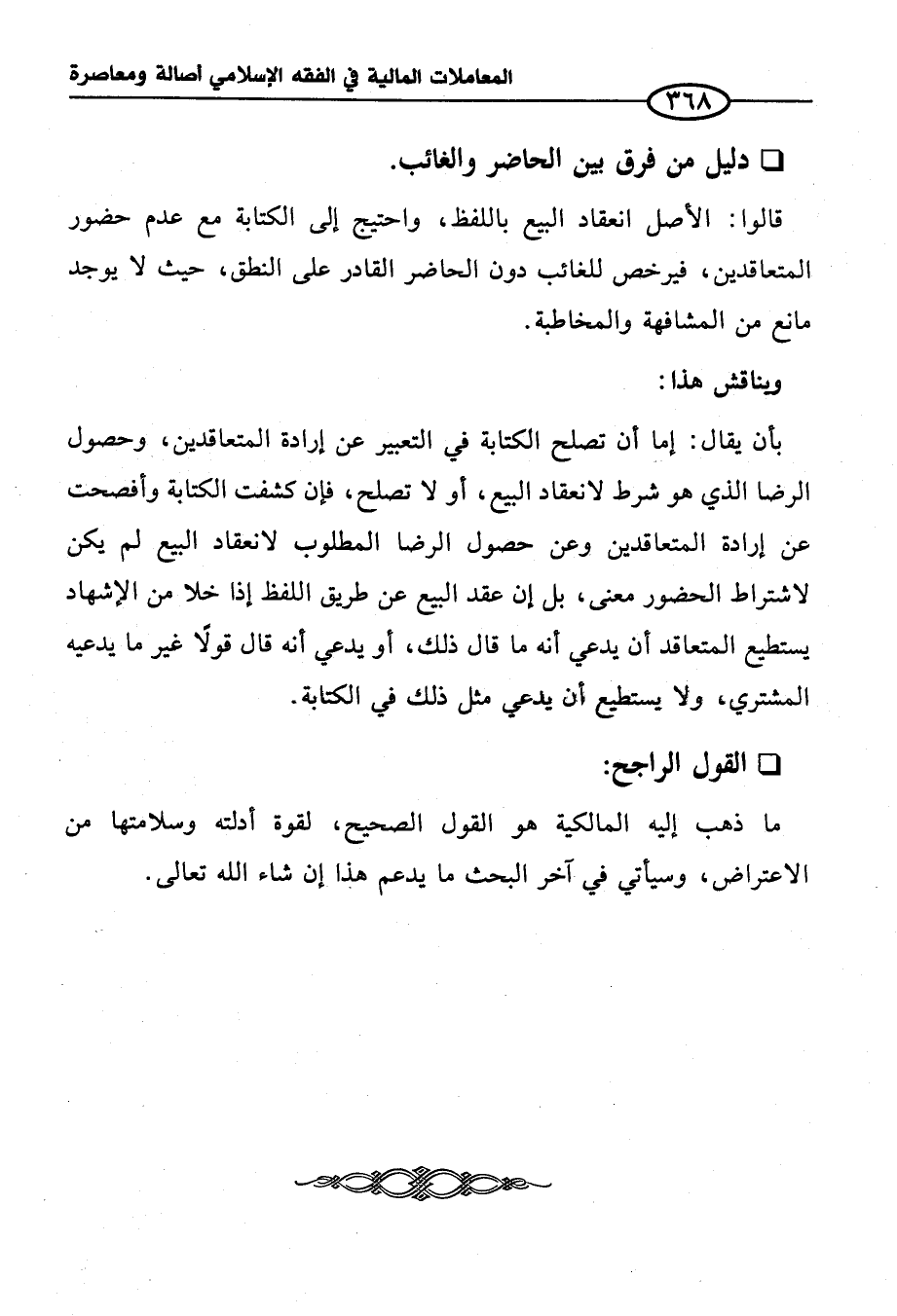 بأن يقال: إما أن تصلح الكتابة في التعبير عن إرادة المتعاقدين، وحصول الرضا الذي هو شرط لانعقاد البيع، أو لا تصلح، فإن كشفت الكتابة وأفصحت عن إرادة المتعاقدين وعن حصول الرضا المطلوب لانعقاد البيع لم يكن لاشتراط الحضور معنى، بل إن عقد البيع عن طريق اللفظ إذا خلا من الإشهاد يستطيع المتعاقد أن يدعي أنه ما قال ذلك، أو يدعي أنه قال قولًا غير ما يدعيه المشتري, ولا يستطيع أن يدعي مثل ذلك في الكتابة.