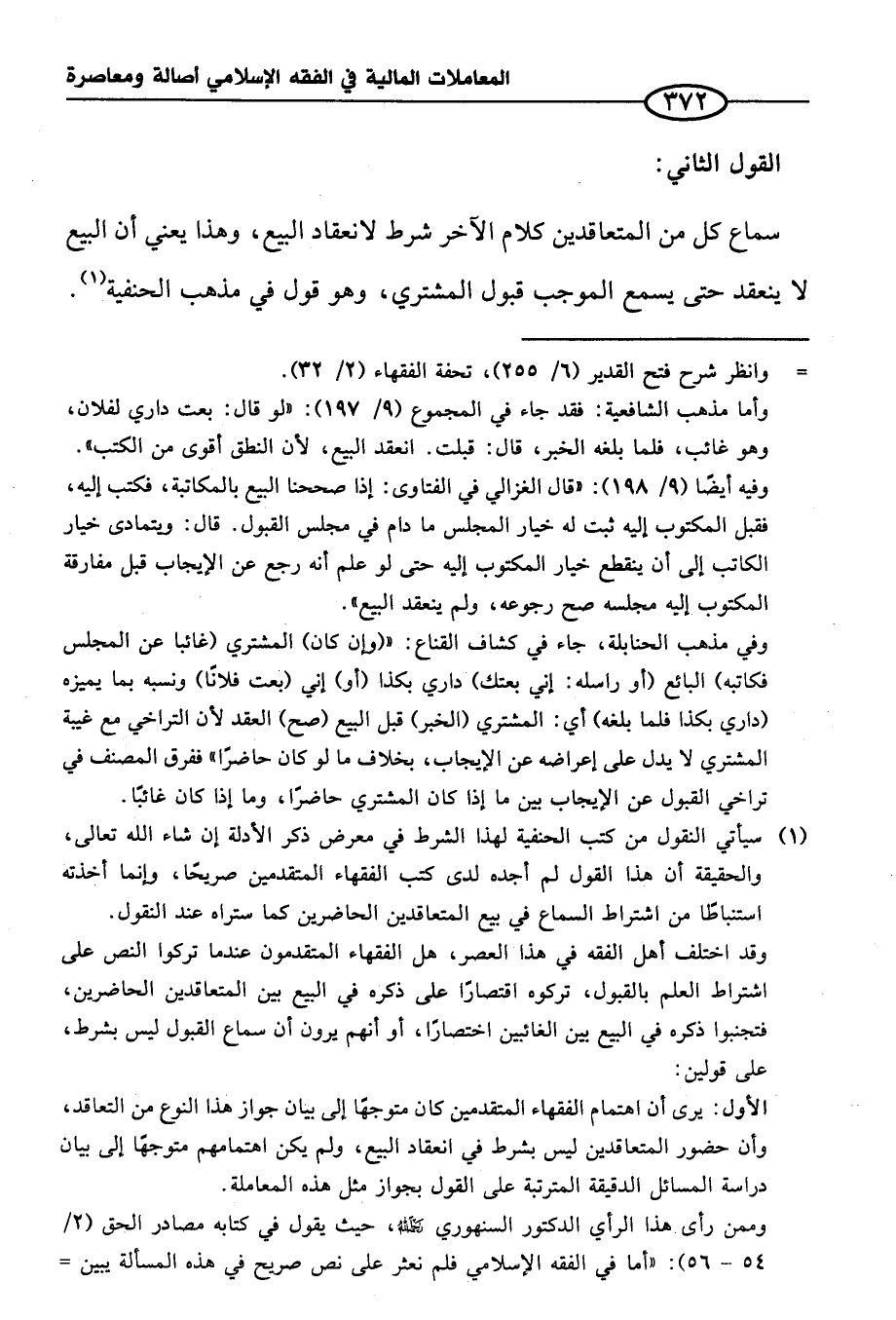 (¬١) سيأتي النقول من كتب الحنفية لهذا الشرط في معرض ذكر الأدلة إن شاء الله تعالى، والحقيقة أن هذا القول لم أجده لدى كتب الفقهاء المتقدمين صريحا، وإنما أخذته استنباطا من اشراط السماع في بيع المتعاقدين الحاضرين كما ستراه عند النقول.