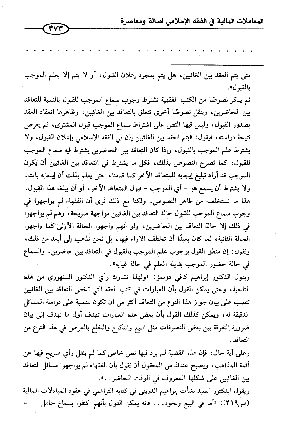 ثم يذكر نصوصا من الكتب الفقهية تشترط وجوب سماع الموجب للقبول بالنسبة للتعاقد بين الحاضرين، وينقل نصوصا أخرى تتعلق بالتعاقد بين الغائبين، وظاهرها انعقاد العقد بصدور القبول، وليس فيها النص على اشتراط سماع الموجب قبول المشتري، ثم يعرض نتيجة دراسته، فيقول: "يتم العقد بين الغائبين إذن في الفقه الإسلامي بإعلان القبول، ولا يشترط علم الموجب بالقبول، وإذا كان التعاقد بين الحاضرين يشترط فيه سماع الموجب للقبول، كما تصرح النصوص بذلك، فكل ما يشترط في التعاقد بين الغائبين أن يكون الموجب قد أراد تبليغ إيجابه للمتعاقد الآخر كما قدمنا، حتى يعلم بذلك أن إيجابه بات، ولا يشترط أن يسمع هو -أي الموجب- قبول المتعاقد الآخر، أو أن يبلغه هذا القبول. هذا ما نستخلصه من ظاهر النصوص. ولكنا مع ذلك نرى أن الفقهاء لم يواجهوا في وجوب سماع الموجب للقبول حالة التعاقد بين الغائبين مواجهة صريحة، وهم لم يواجهوا في ذلك إلا حالة التعاقد بين الحاضرين، ولو أنهم واجهوا الحالة الأولى كما واجهوا الحالة الثانية، لما كان بعيدا أن تختلف الآراء فيها، بل نحن نذهب إلى أبعد من ذلك، ونقول: إن منطق القول بوجوب علم الموجب بالقبول في التعاقد بين حاضرين، والسماع في حالة حضور الموجب يقابله العلم في حالة غيابه".