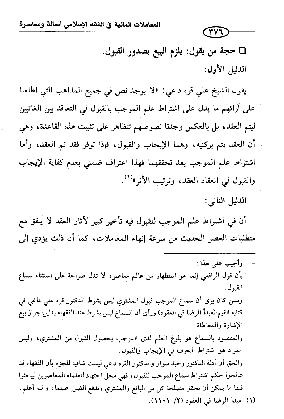 يقول الشيخ علي قره داغي: "لا يوجد نص في جميع المذاهب التي اطلعنا على آرائهم ما يدل على اشتراط علم الموجب بالقبول في التعاقد بين الغائبين ليتم العقد، بل بالعكس وجدنا نصوصهم تتظاهر على تثبيت هذه القاعدة، وهي أن العقد يتم بركنيه، وهما الإيجاب والقبول، فإذا توفر فقد تم العقد، وأما اشتراط علم الموجب بعد تحققهما فهذا اعتراف ضمني بعدم كفاية الإيجاب والقبول في انعقاد العقد، وترتيب الأثر" (¬١).