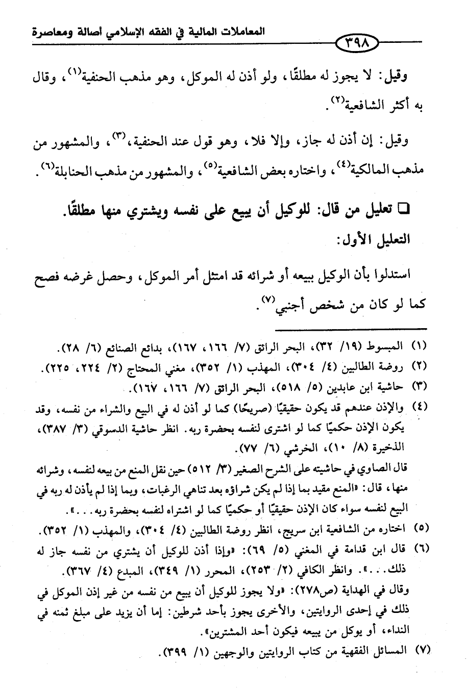وقال في الهداية (ص ٢٧٨): "ولا يجوز للوكيل أن يبيع من نفسه من غير إذن الموكل في ذلك في إحدى الروايتين، والأخرى يجوز بأحد شرطين: إما أن يزيد على مبلغ ثمنه في النداء، أو يوكل من يبيعه فيكون أحد المشترين".