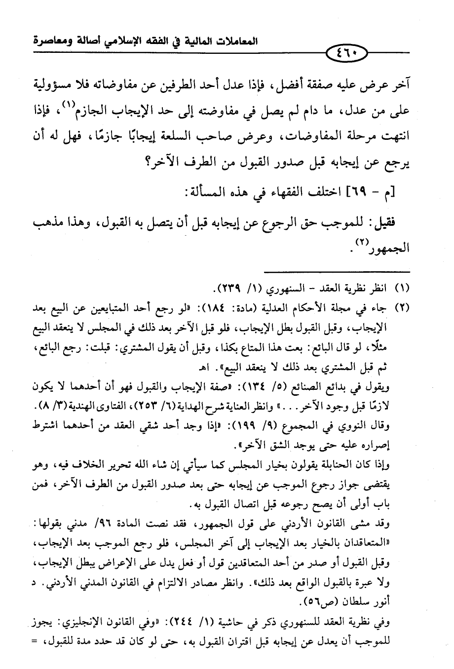 (¬٢) جاء في مجلة الأحكام العدلية (مادة: ١٨٤): "لو رجع أحد المتبايعين عن البيع بعد الإيجاب، وقبل القبول بطل الإيجاب، فلو قبل الآخر بعد ذلك في المجلس لا ينعقد البيع مثلًا، لو قال البائع: بعت هذا المتاع بكذا، وقبل أن يقول المشتري: قبلت: رجع البائع، ثم قبل المشتري بعد ذلك لا ينعقد البيع". اهـ