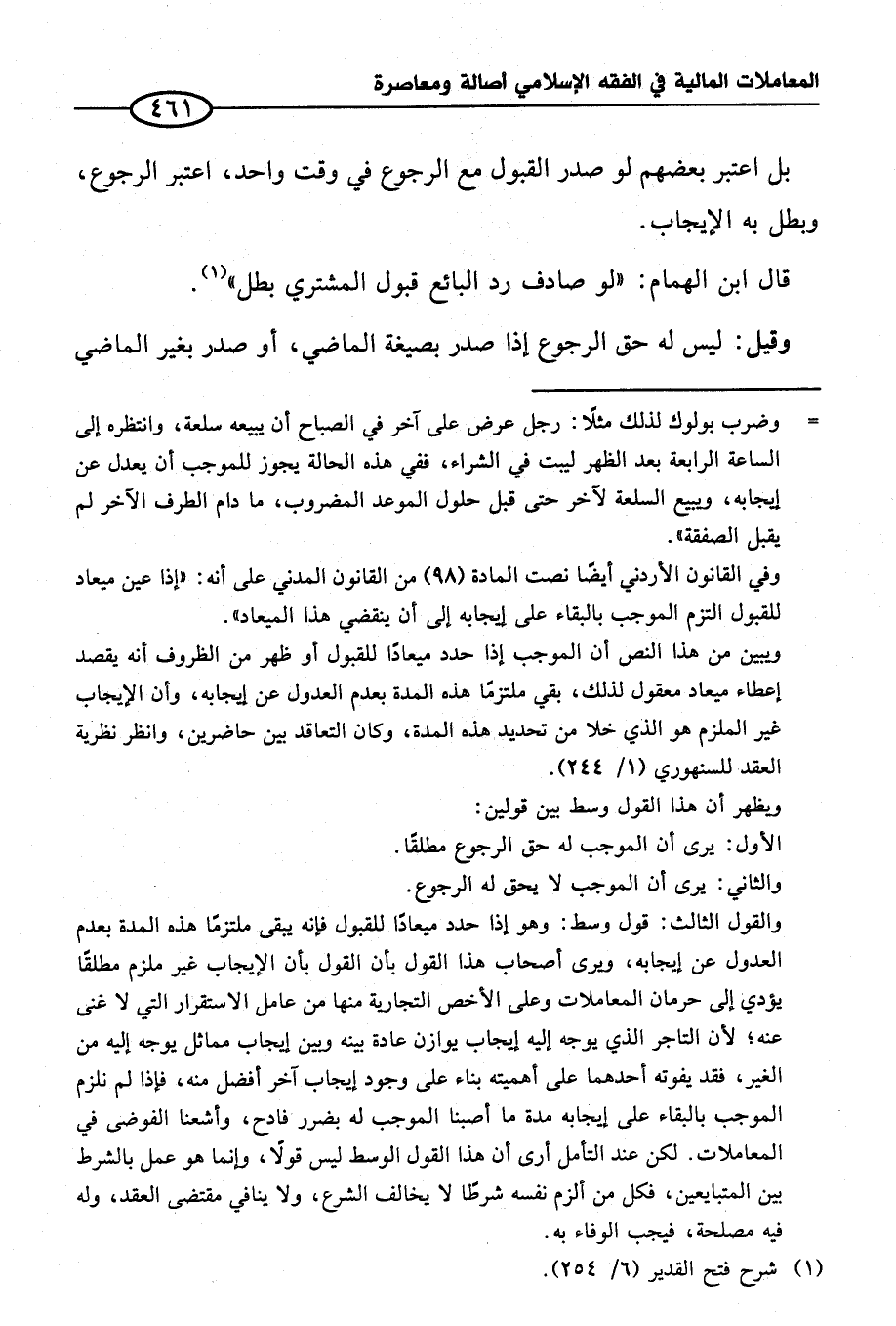 = وضرب بولوك لذلك مثلًا: رجل عرض على آخر في الصباح أن يبيعه سلعة، وانتظره إلى الساعة الرابعة بعد الظهر ليبت في الشراء، ففي هذه الحالة يجوز للموجب أن يعدل عن إيجابه، ويبيع السلعة لآخر حتى قبل حلول الموعد المضروب، ما دام الطرف الآخر لم يقبل الصفقة".