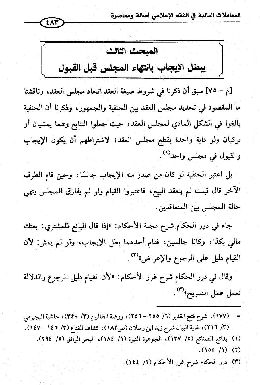 [م - ٧٥] سبق أن ذكرنا في شروط صيغة العقد اتحاد مجلس العقد، وناقشنا ما المقصود في تحديد مجلس العقد بين الحنفية والجمهور، وذكرنا أن الحنفية بالغوا في الشكل المادي لمجلس العقد، حيث جعلوا التتابع وهما يمشيان أو يركبان ولو دابة واحدة يقطع مجلس العقد؛ لاشتراطهم أن يكون الإيجاب والقبول في مجلس واحد (¬١).