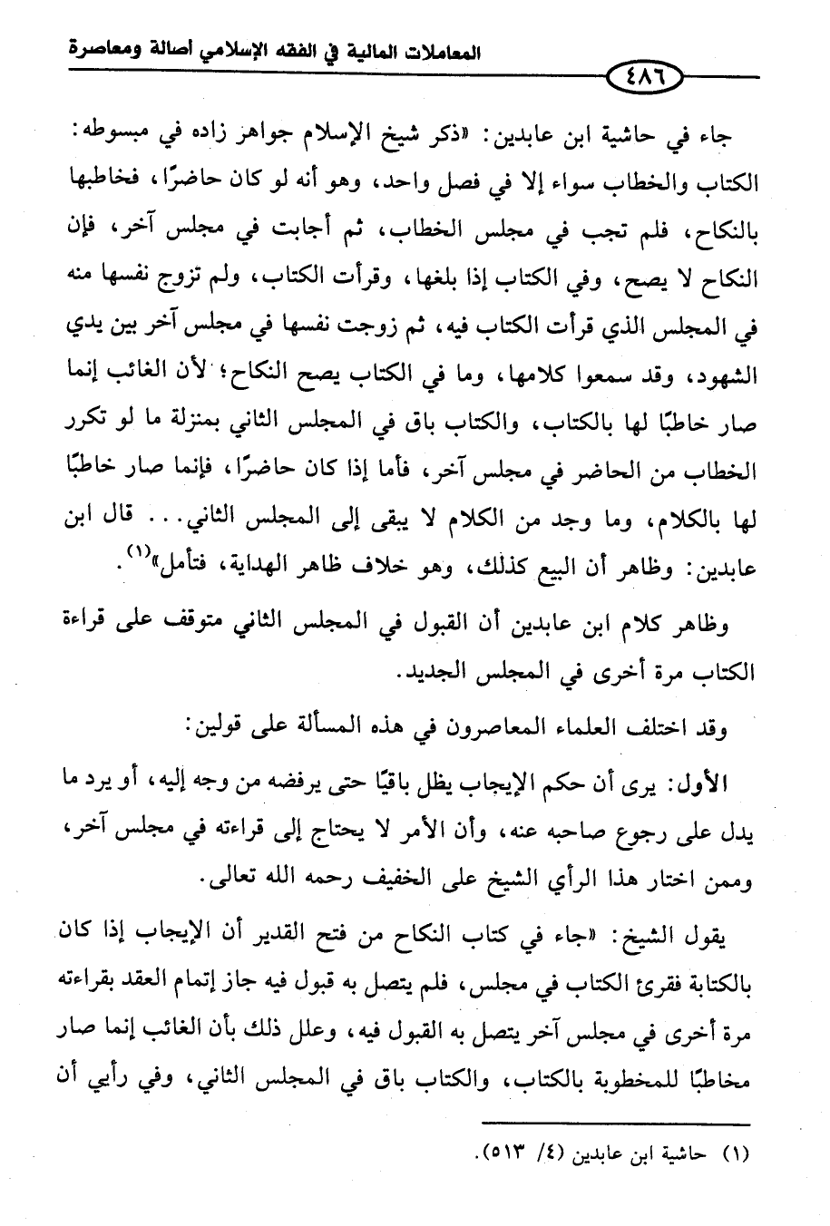 يقول الشيخ: "جاء في كتاب النكاح من فتح القدير أن الإيجاب إذا كان بالكتابة فقرئ الكتاب في مجلس، فلم يتصل به قبول فيه جاز إتمام العقد بقراءته مرة أخرى في مجلس آخر يتصل به القبول فيه، وعلل ذلك بأن الغائب إنما صار مخاطبًا للمخطوبة بالكتاب، والكتاب باق في المجلس الثاني، وفي رأيي أن
