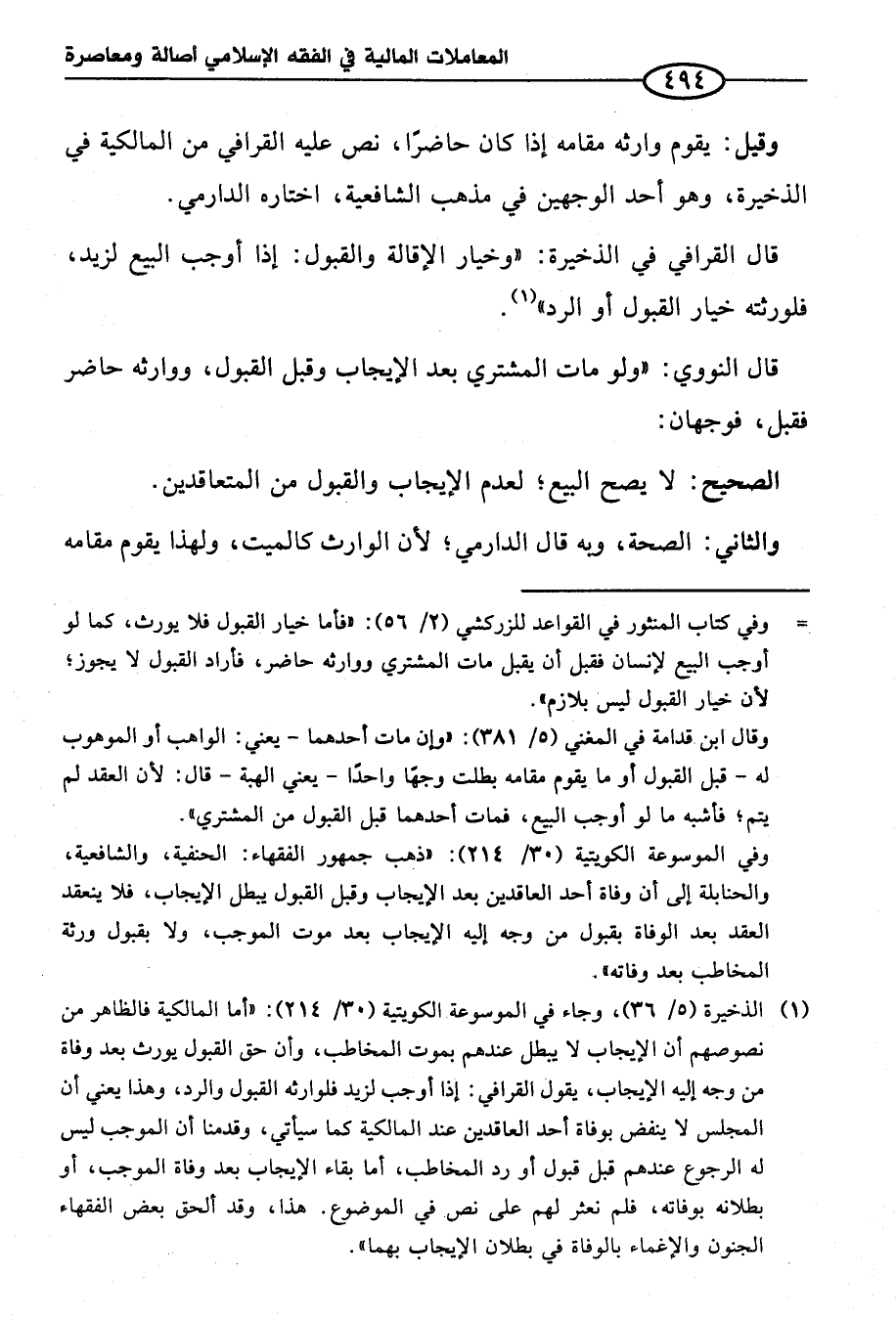 (¬١) الذخيرة (٥/ ٣٦)، وجاء في الموسوعة الكويتية (٣٠/ ٢١٤): "أما المالكية فالظاهر من نصوصهم أن الإيجاب لا يبطل عندهم بموت المخاطب، وأن حق القبول يورث بعد وفاة من وجه إليه الإيجاب، يقول القرافي: إذا أوجب لزيد فلوارثه القبول والرد، وهذا يعني أن المجلس لا ينفض بوفاة أحد العاقدين عند المالكية كما سيأتي، وقدمنا أن الموجب ليس له الرجوع عندهم قبل قبول أو رد المخاطب، أما بقاء الإيجاب بعد وفاة الموجب، أو بطلانه بوفاته، فلم نعثر لهم على نص في الموضوع. هذا، وقد ألحق بعض الفقهاء الجنون والإغماء بالوفاة في بطلان الإيجاب بهما".