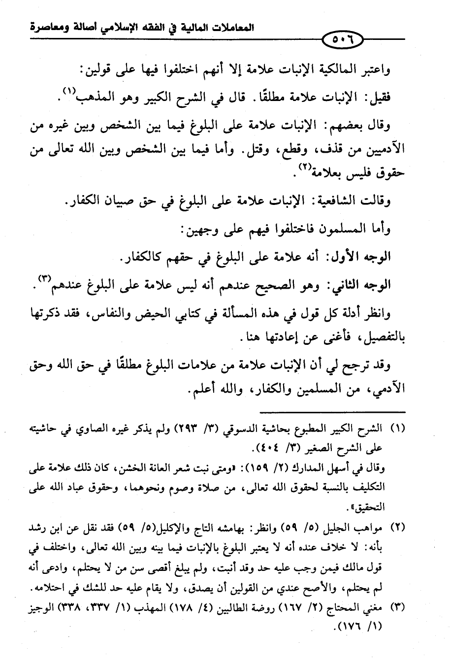 (¬٢) مواهب الجليل (٥/ ٥٩) وانظر: بهامشه التاج والإكليل (٥/ ٥٩) فقد نقل عن ابن رشد بأنه: لا خلاف عنده أنه لا يعتبر البلوغ بالإنبات فيما بينه وبين الله تعالى، واختلف في قول مالك فيمن وجب عليه حد وقد أنبت، ولم يبلغ أقصى سن من لا يحتلم، وادعى أنه لم يحتلم، والأصح عندي من القولين أن يصدق، ولا يقام عليه حد للشك في احتلامه.