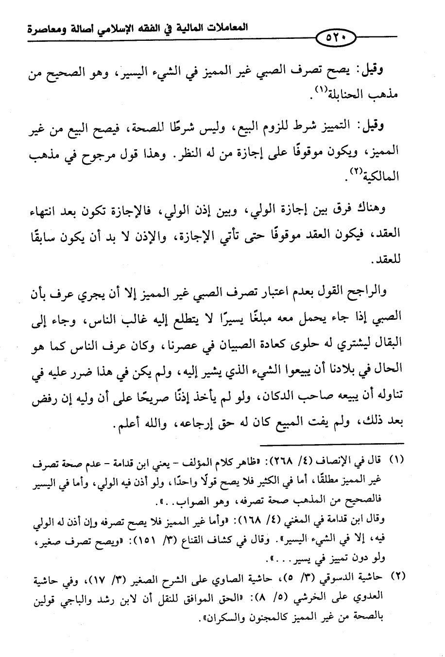 (¬١) قال في الإنصاف (٤/ ٢٦٨): "ظاهر كلام المؤلف -يعني ابن قدامة- عدم صحة تصرف غير المميز مطلقاً، أما في الكثير فلا يصح قولًا واحداً، ولو أذن فيه الولي، وأما في اليسير فالصحيح من المذهب صحة تصرفه، وهو الصواب .. ".