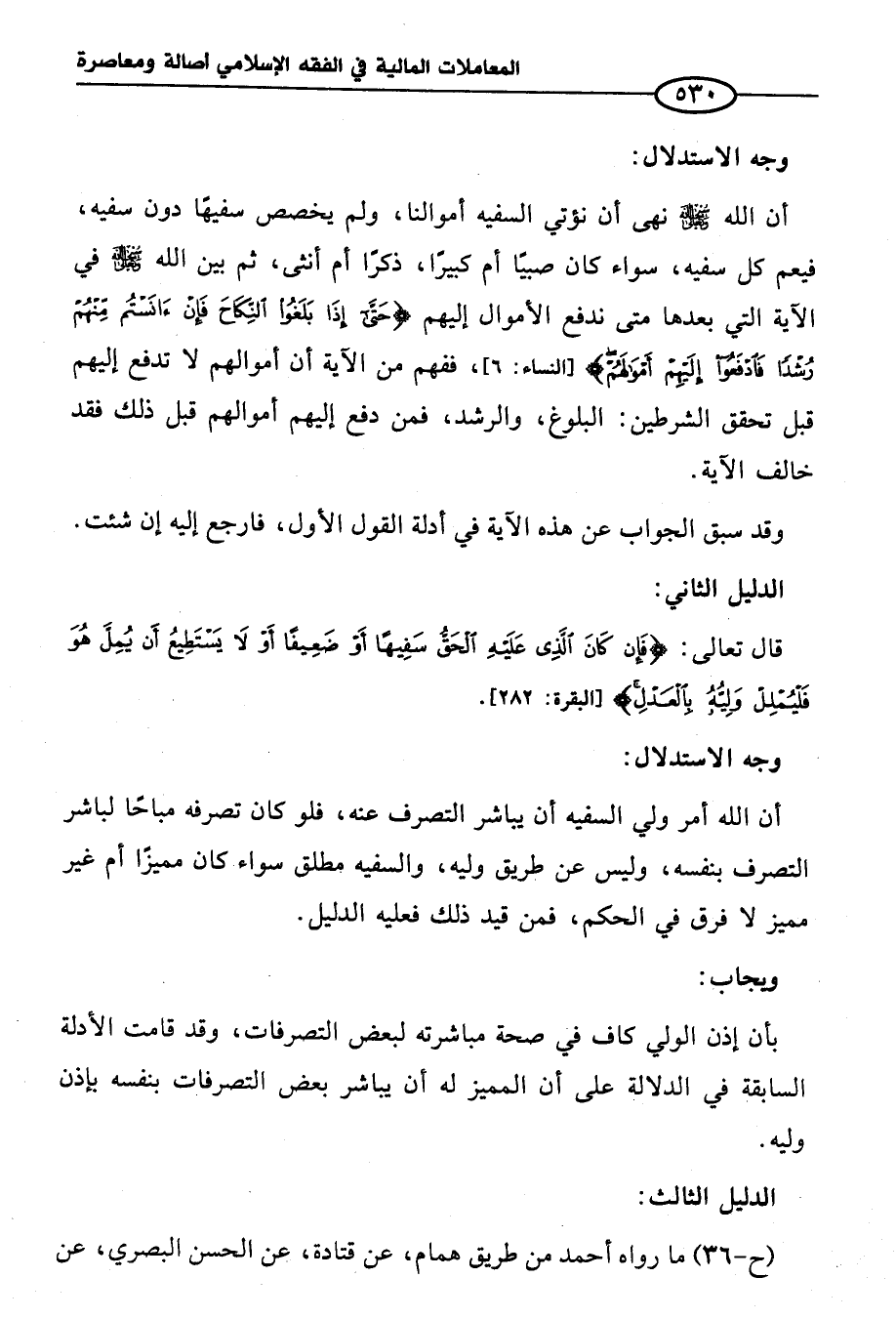 أن الله سبحانه وتعالى نهى أن نؤتي السفيه أموالنا، ولم يخصص سفيهًا دون سفيه، فيعم كل سفيه، سواء كان صبيًا أم كبيرًا، ذكراً أم أنثى، ثم بين الله سبحانه وتعالى في الآية التي بعدها متى ندفع الأموال إليهم {حَتَّى إِذَا بَلَغُوا النِّكَاحَ فَإِنْ آنَسْتُمْ مِنْهُمْ رُشْدًا فَادْفَعُوا إِلَيْهِمْ أَمْوَالَهُمْ} [النساء: ٦]، ففهم من الآية أن أموالهم لا تدفع إليهم قبل تحقق الشرطين: البلوغ، والرشد، فمن دفع إليهم أموالهم قبل ذلك فقد خالف الآية.