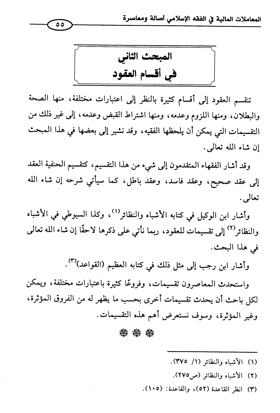 وأشار ابن الوكيل في كتابه الأشباه والنظائر (¬١)، وكذا السيوطي في الأشباه والنظائر (¬٢) إلى تقسيمات للعقود، ربما نأتي على ذكرها لاحقًا إن شاء الله تعالى في هذا البحث.