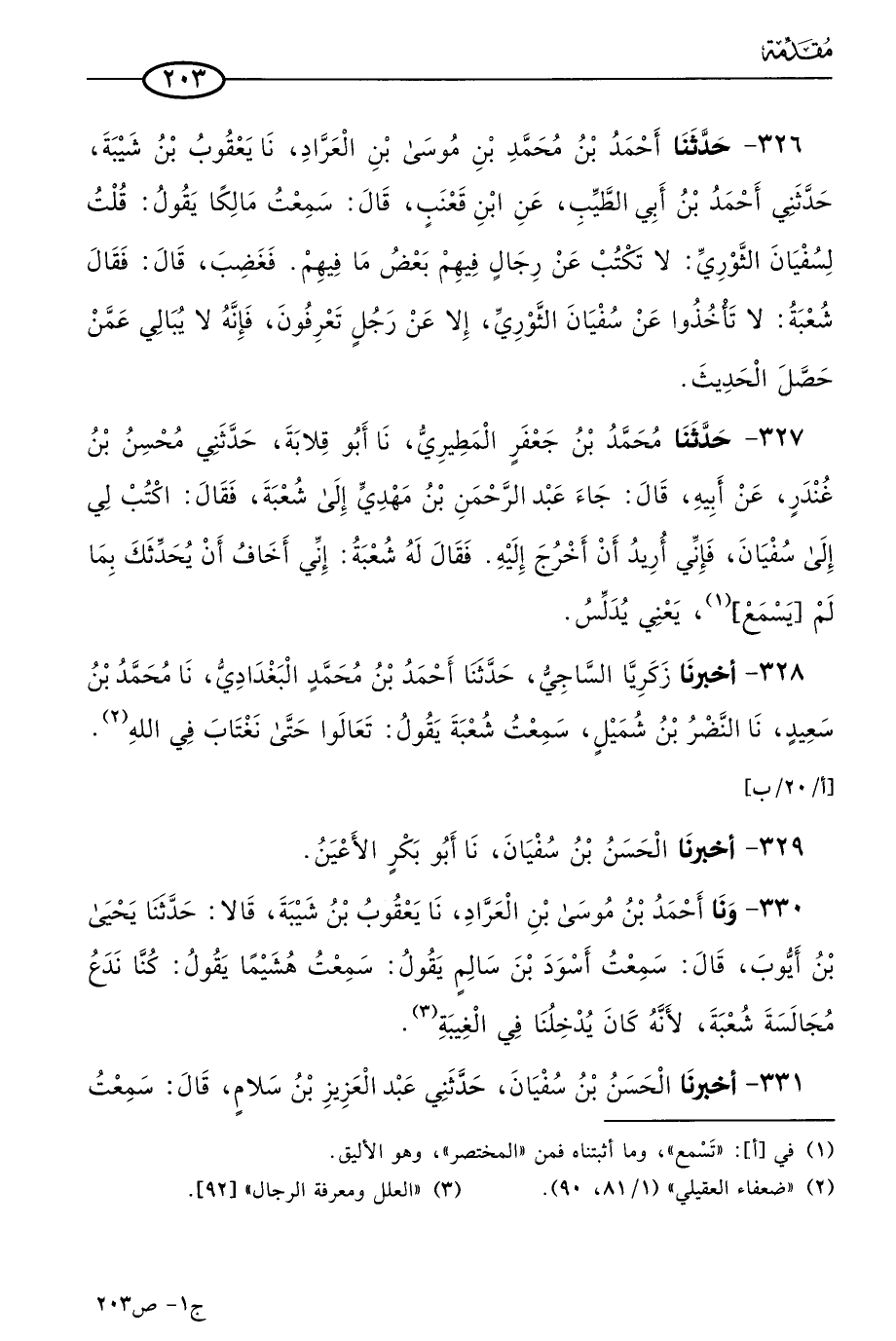327 - حَدثنا مُحمد بن جعفر المطيري، حَدثنا أَبو قلابة، حَدَّثني محسن بن غندر، عن أبيه، قال: جاء عَبد الرحمن بن مهدي إلى شُعبَة فقال: اكتب لي إلى سفيان، فإني أريد أن أخرج إليه فقال له شُعبَة: إني أخاف أن يحدثك بما لم يسمع، يعني يدلس.