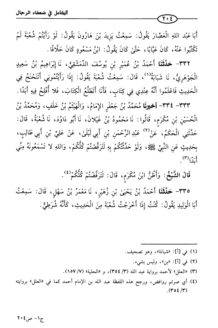 335 - حَدثنا أحمد بن يَحيى بن زهير، حَدثنا معمر بن سهل، قال: سمعتُ أبا الوليد يقول: كنت إذا أخرجت شُعبَة من الحديث كأنه شُرَطي.