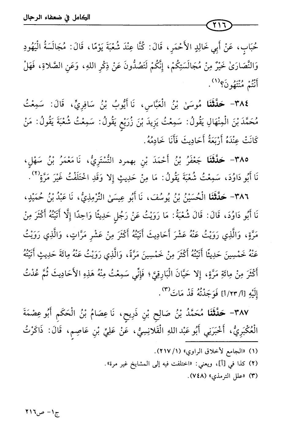 386 - حَدثنا الحسين بن يوسف، حَدثنا أَبو عيسى التِّرمِذِي، حَدثنا عَبد بن حميد، حَدثنا أَبو داود، قال: قال شُعبَة: ما رويت عن رجل حديثًا واحدا إلا أتيته أكثر من مرة، والذي رويت عنه عشر أحاديث أتيته أكثر من عشر مرات، والذي رويت عنه خمسين حديثًا أتيته أكثر من خمسين مرة، والذي رويت عنه مِئَة حديث أتيته أكثر من مِئَة مرة، إلا حيان البارقي فإني سمعت منه هذه الأحاديث ثم عدت إليه فوجدته قد مات.