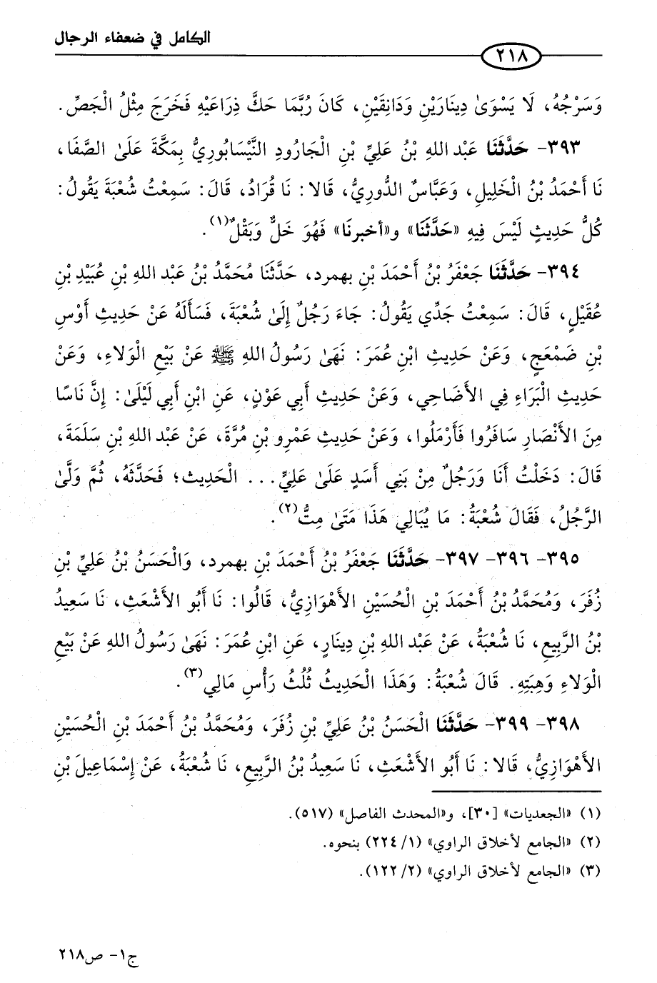 395 - 396 - 397 - حَدثنا جعفر بن أحمد بن بهمرد، والحسن بن علي بن زفر، ومُحمد بن أحمد بن الحسين الأهوازي، قالوا: حَدثنا أَبو الأشعث، حَدثنا سعيد بن الربيع، حَدثنا شُعبَة، عن عَبد الله بن دينار، عن ابن عُمر؛ نهى رسول الله صَلى الله عَليه وسَلم عن بيع الولاء وهبته. قال شُعبَة: وهذا الحديث ثلث رأس مالي.