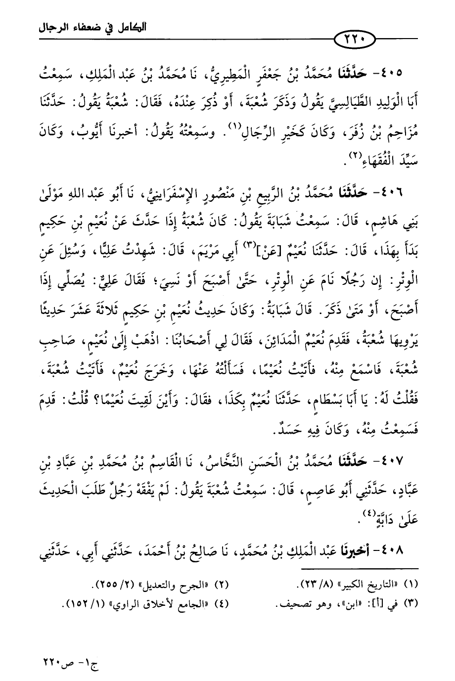 405 - حَدثنا مُحمد بن جعفر المطيري، حَدثنا مُحمد بن عَبد الملك، سمعت أبا الوليد الطيالسي يقول، وذكر شُعبَة، أو ذُكِر عنده، فقال: شُعبَة يقول: حَدثنا مزاحم بن زفر، وكان كخير الرجال. وسمعته يقول: أخبرنا أيوب، وكان سيد الفقهاء.