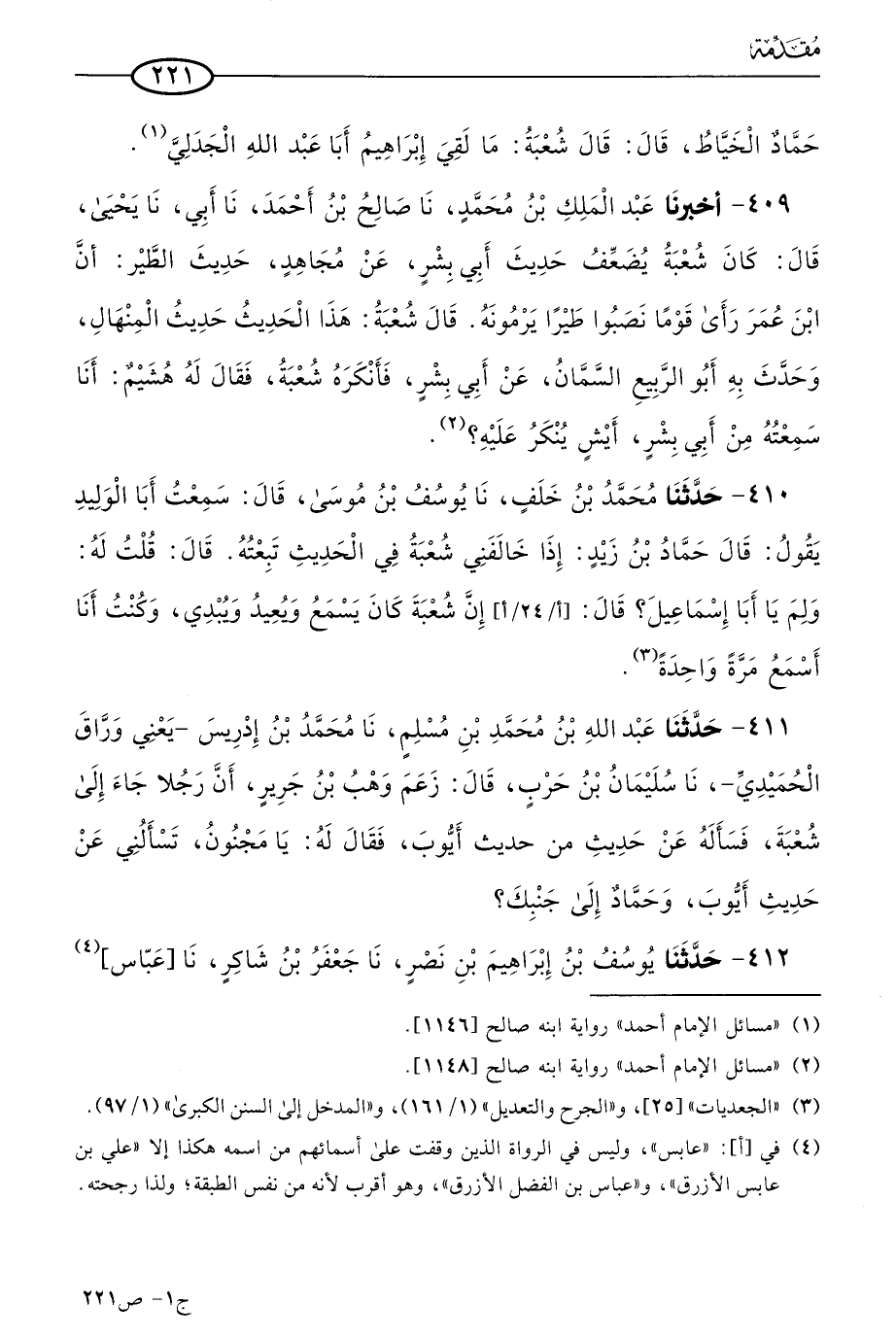 410 - حَدثنا مُحمد بن خلف، حَدثنا يوسف بن موسى، قال: سمعتُ أبا الوليد يقول: قال حماد بن زيد: إذا خالفني شُعبَة في الحديث تبعته، قال: قلتُ له: ولم يا أبا إسماعيل؟ قال: إِن شُعبَة كان يسمع ويعيد ويبدي وكنت أنا أسمع مرة واحدة.
