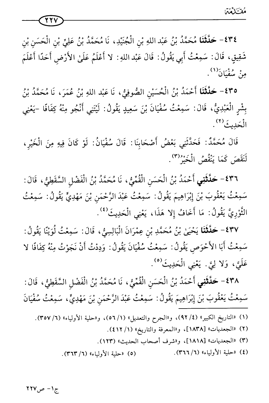 434 - حَدثنا مُحمد بن عَبد الله بن الجنيد، حَدثنا مُحمد بن علي بن الحسن بن شقيق قال: سمعتُ أبي يقول: قال عَبد الله: لا أعلم على الأرض أحدًا أعلم من سفيان.