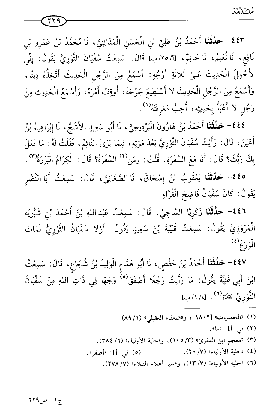 443 - حَدثنا أحمد بن علي بن الحسن المدائني، حَدثنا مُحمد بن عَمرو بن نافع، حَدثنا نعيم، حَدثنا حاتم، قال: سمعتُ سفيان الثَّوري يقول: إني لأحمل الحديث على ثلاثة أوجه: أسمع من الرجل الحديث أتخذه دينا، وأسمع من الرجل الحديث لا أستطيع جرحه أُوقف أمره، وأسمع الحديث من رجل لا أعبأ بحديثه، أحب معرفته.