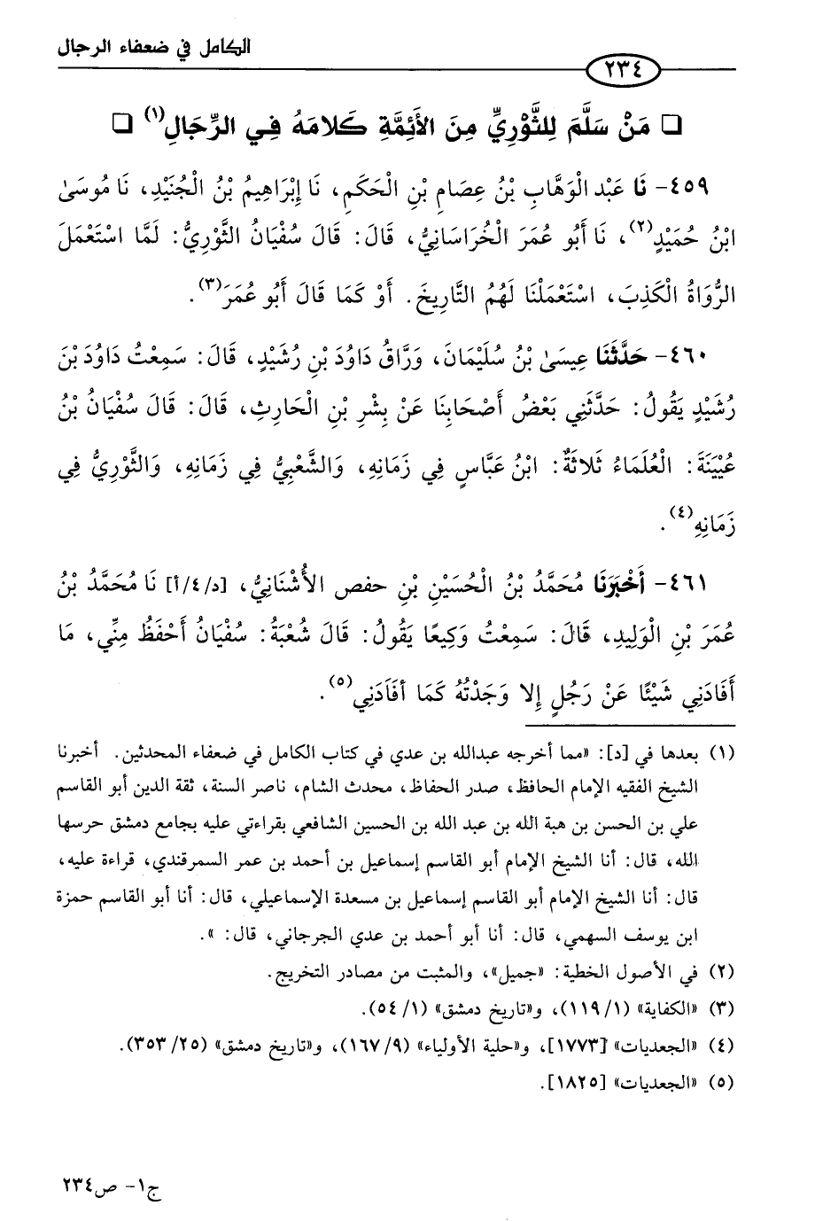 459 - حَدثنا عَبد الوهاب بن عصام بن الحكم، حَدثنا إبراهيم بن الجنيد، حَدثنا موسى بن حميد (1)، حدثنا أَبو عُمر الخراساني، قال: قال سفيان الثَّوري: لما استعمل الرواة الكذب استعملنا لهم التاريخ، أو كما قال أَبو عُمر.