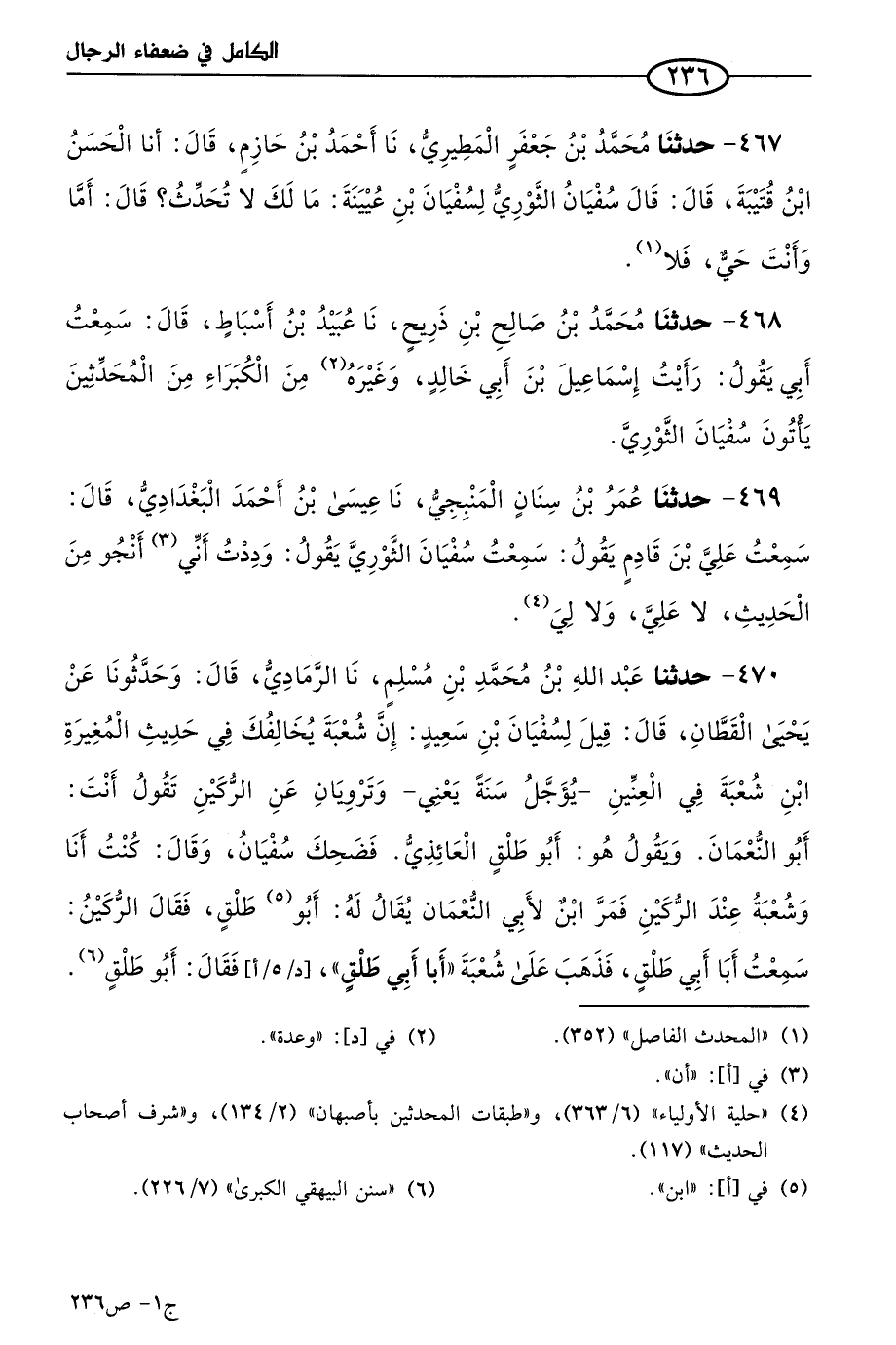 470 - حدثنا عَبد الله بن مُحمد بن مسلم، حدثنا الرمادي قال: وحدثونا عن يَحيى القطان قال: قيل لسفيان بن سعيد: إن شُعبَة يخالفك في حديث المغيرة بن شُعبَة؛ في العِنِّين يؤجل سنة، يعني وترويان عن الركين، تقول أنت: أَبو النعمان، ويقول هو: أَبو طلق العائذي. فضحك سفيان وقال: كنت أنا وشُعبة عند الركين، فمر ابنٌ لأبي النعمان، يُقال له: أَبو طلق، فقال الركين: سمعت أبا أبي طلق، فذهب على شُعبَة «أَبا أبي طلق»، فقال أَبو طلق.