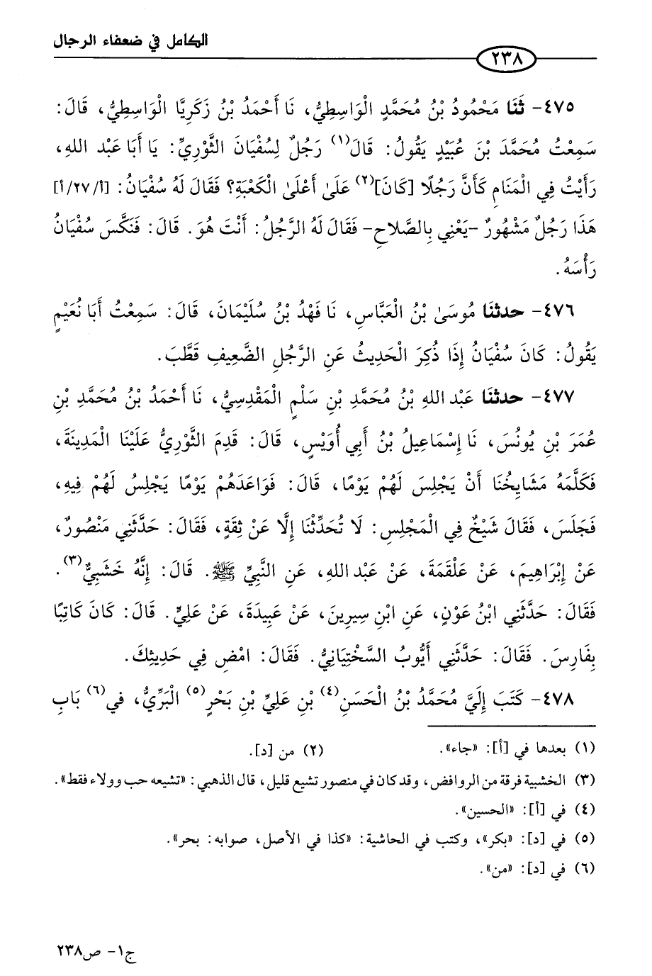 476 - حَدثنا موسى بن العباس، حَدثنا فهد بن سليمان، قال: سمعتُ أبا نعيم، يقول: كان سفيان إذا ذُكر الحديث عن الرجل الضعيف قطَّب.