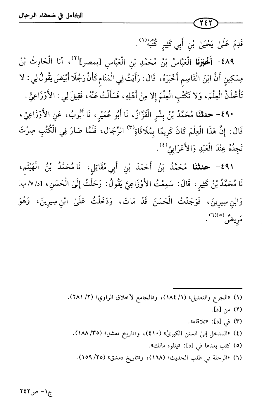 489 - أخبرنا العباس بن مُحمد بن العباس بمصر، أخبرنا الحارث بن مسكين، أن ابن القاسم أخبره، قال: رأيت في المنام كأن رجلاً أبيضَ يقول لي: لا تأخذن العلم، ولا تكتب العلم إلا من أهله، فسألت عنه، فقيل لي: الأَوزاعي.
