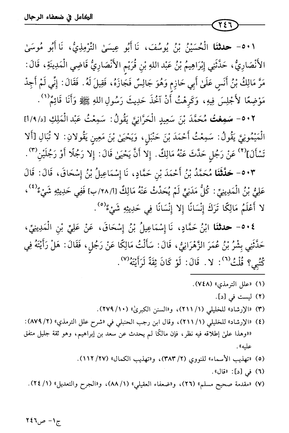503 - حَدثنا مُحَمد بن أَحمد بن حماد، حَدثنا إِسماعيل بن إِسحاق، قَال: قَال علي بن المديني: كل مدني لم يحَدَّث عَنه مالك ففي حديثه شيء، لاَ أعلم مالكا ترك إِنسانا إِلاَّ إِنسانا في حديثه شيء.