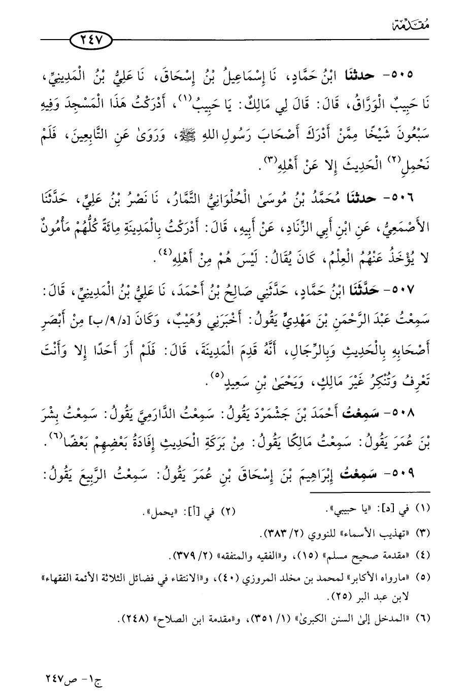 505 - حَدثنا ابن حماد، حَدثنا إِسماعيل بن إِسحاق، حَدثنا علي بن المديني، حَدثنا حبيب الوراق، قَال: قَال لي مالك: يا حبيب، أدركت هذا المسجد وفيه سبعون شيخا ممن أدرك أصحاب رسول الله صَلى الله عَليه وَسَلمَ وروى عن التابعين فلم نحمل الحديث إِلاَّ عن أهله.