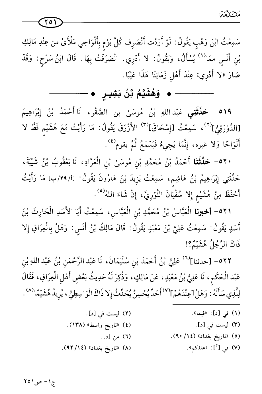 521 - أخبرنا العباس بن مُحمد بن العباس، سمعت أبا الأسد الحارث بن أسد يقول: سَمعتُ علي بن معبد يقول: قال مالك بن أنس: وهل بالعراق إلا ذاك الرجل هشيم.