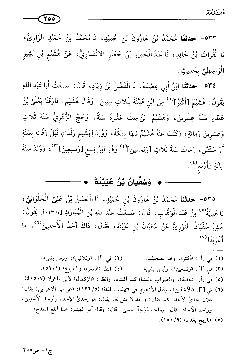 534 - حَدثنا ابن أبي عصمة، حدثنا الفضل بن زياد، قال: سمعتُ أبا عَبد الله يقول: هشيم أكبر من ابن عُيَينة بثلاث سنين، وقال هشيم: فارقنا يَعلَى بن عطاء سنة عشرين، وهشيم ابن ست عشرة سنة، وحج الزُّهْري سنة ثلاث وعشرين ومِئَة، وكتب عنه هشيم فيها بمكة، وولد لهشيم ولدان قبل وفاته بسنة أو سنتين، ومات سنة ثلاث وثمانين، وهو ابن تسع وسبعين، وولد سنة مِئَة وأربع.