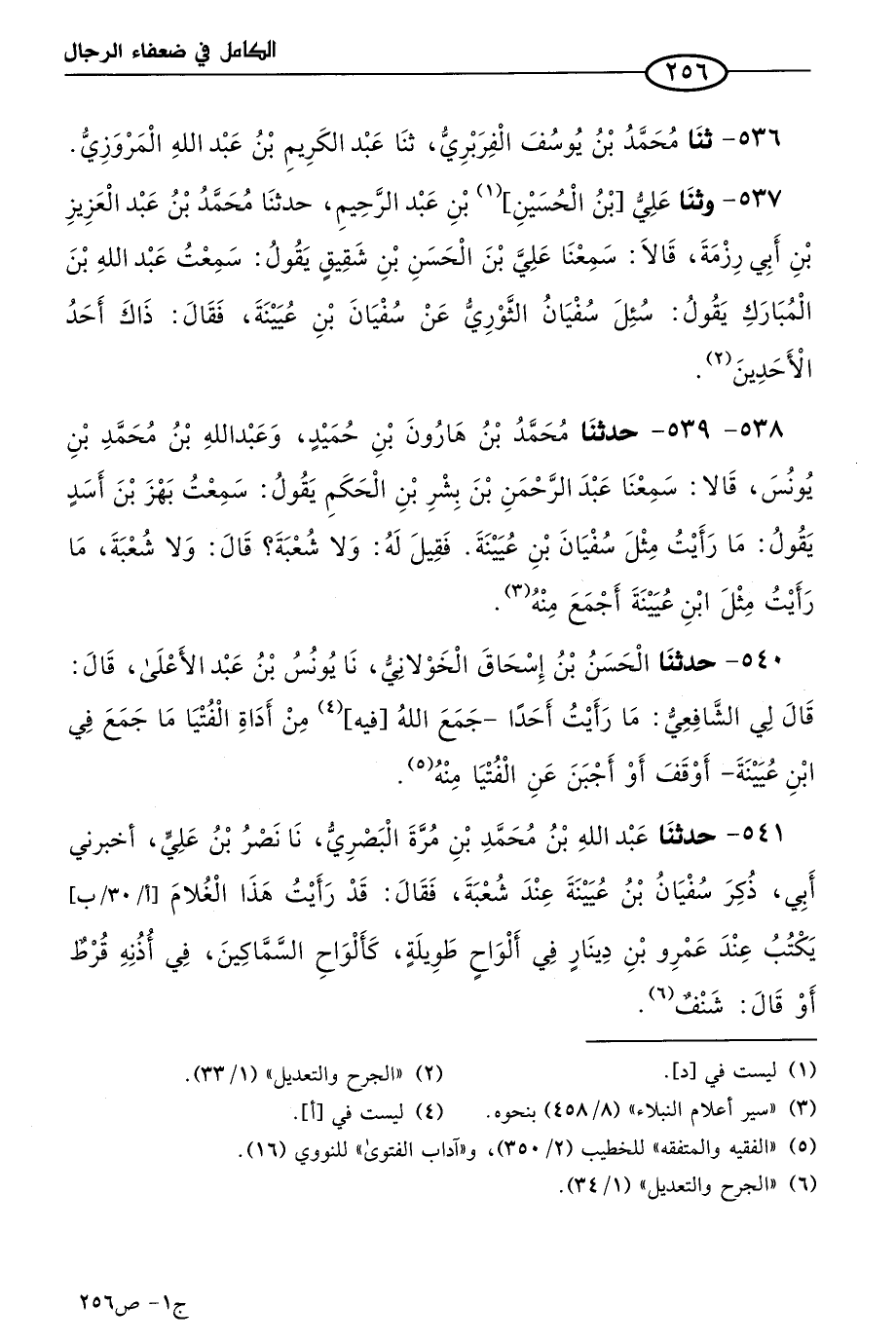 541 - حَدثنا عَبد الله بن مُحمد بن مرة البصري، حدثنا نصر بن علي، أخبرني أبي: ذُكِر سفيان بن عُيَينة عند شُعبَة، فقال: قد رأيت هذا الغلام يكتب عند عَمرو بن دينار في ألواح طويلة كألواح السماكين، في أذنه قرط، أو قال: شنف.