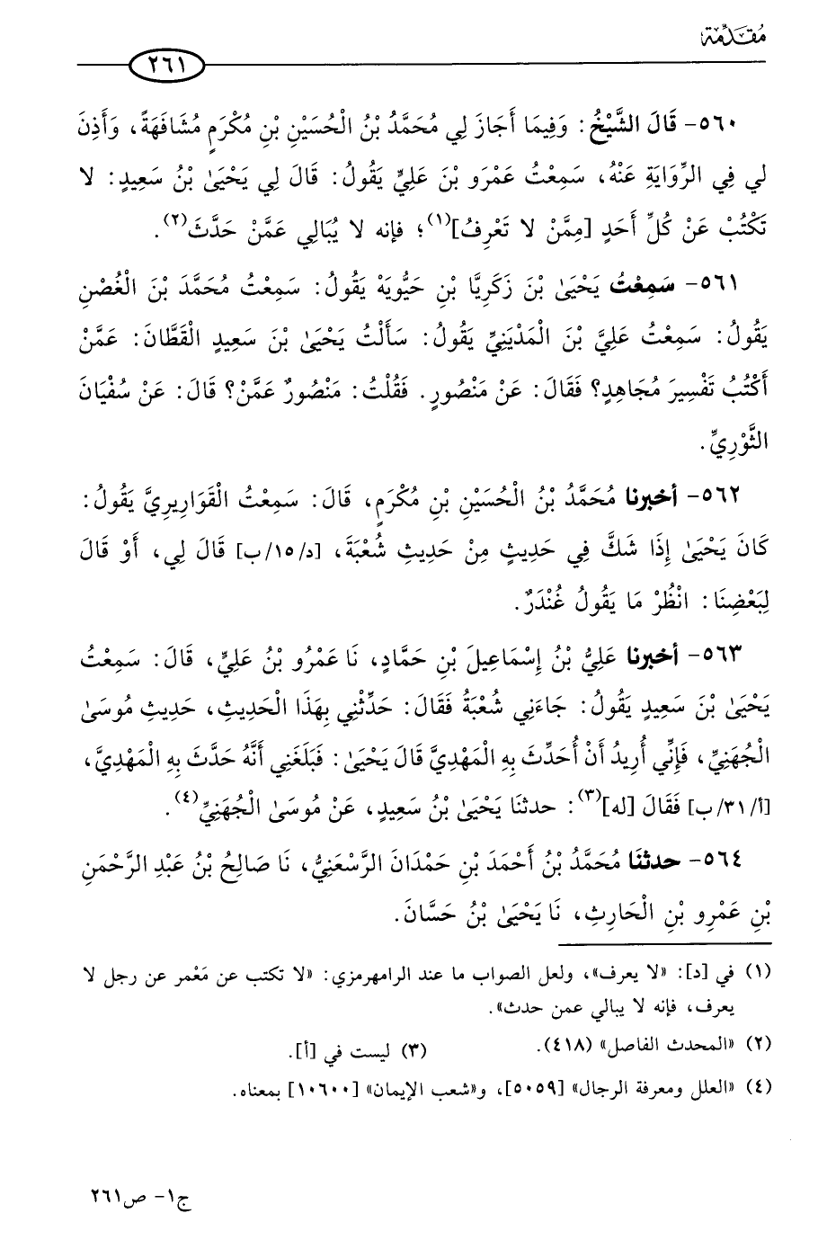 560 - قال الشيخ: وفيما أجاز لي مُحمد بن الحسين بن مكرم مشافهة، وأذن لي في الرواية عنه، سمعت عَمرو بن علي يقول: قال لي يَحيى بن سعيد: لا تكتب عن كل أحد ممن لا تعرف، فإنه لا يبالي عَمَّن حدث.