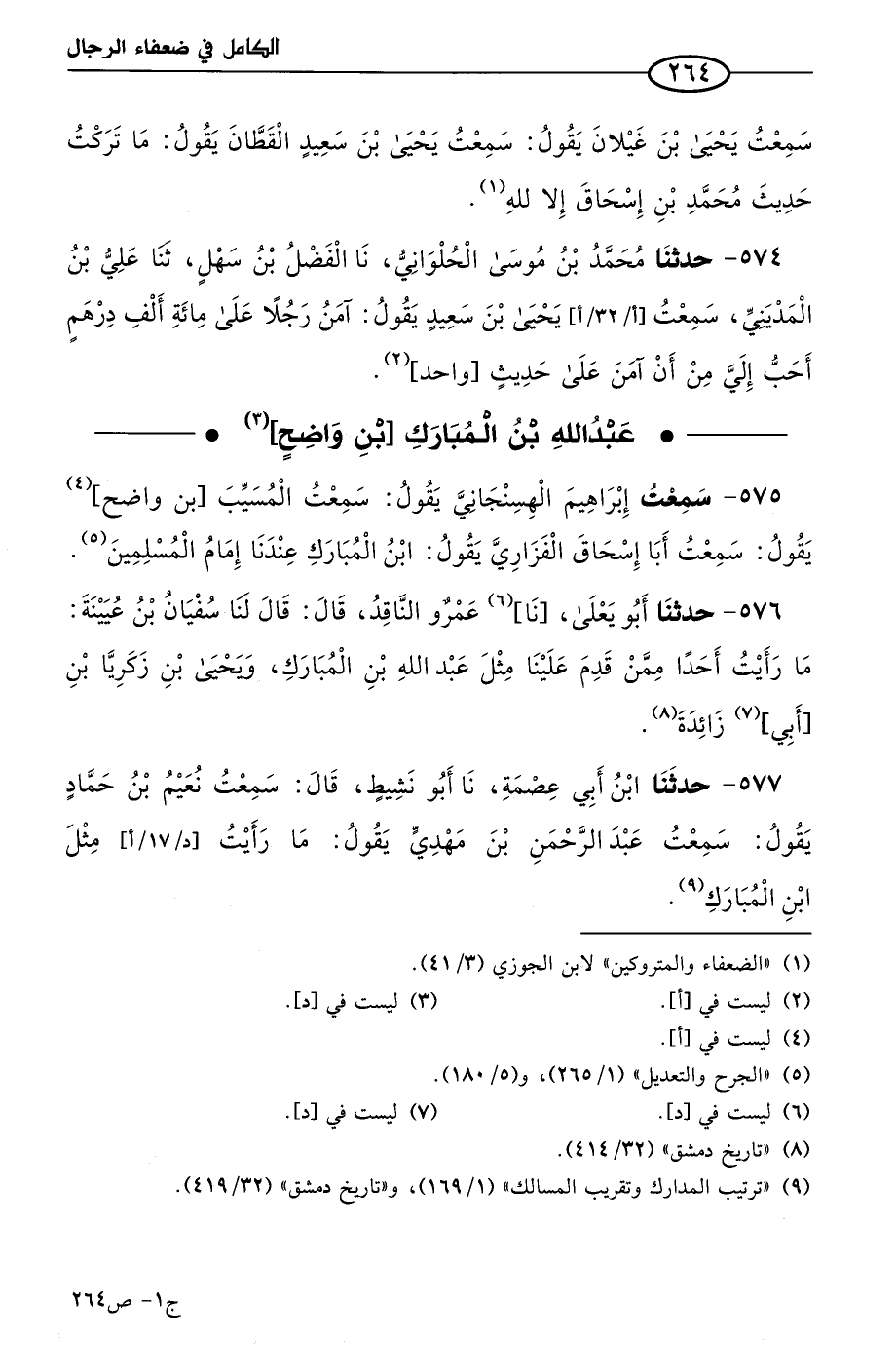 575 - سمعت إبراهيم الهسنجاني يقول: سَمعتُ المُسَيَّب بن واضح يقول: سَمعتُ أبا إسحاق الفزاري، يقول: ابن المبارك عندنا إمام المسلمين.