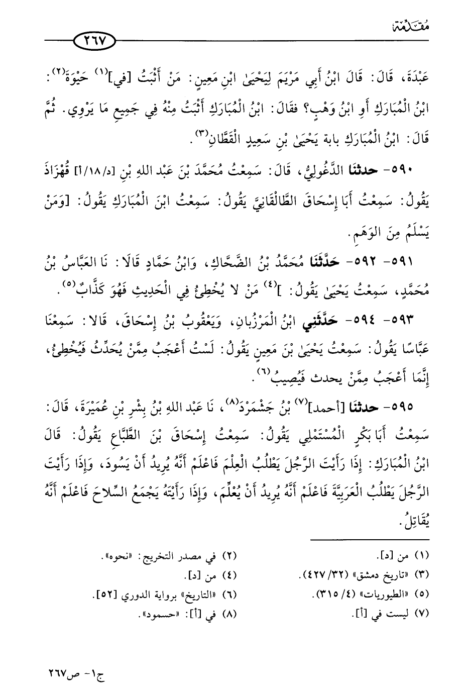 590 - حَدثنا الدغولي، قال: سمعتُ مُحمد بن عَبد الله بن قهزاذ يقول: سَمعتُ أبا إسحاق الطالقاني يقول: سَمعتُ ابن المبارك يقول: ومن يسلم من الوهم؟.