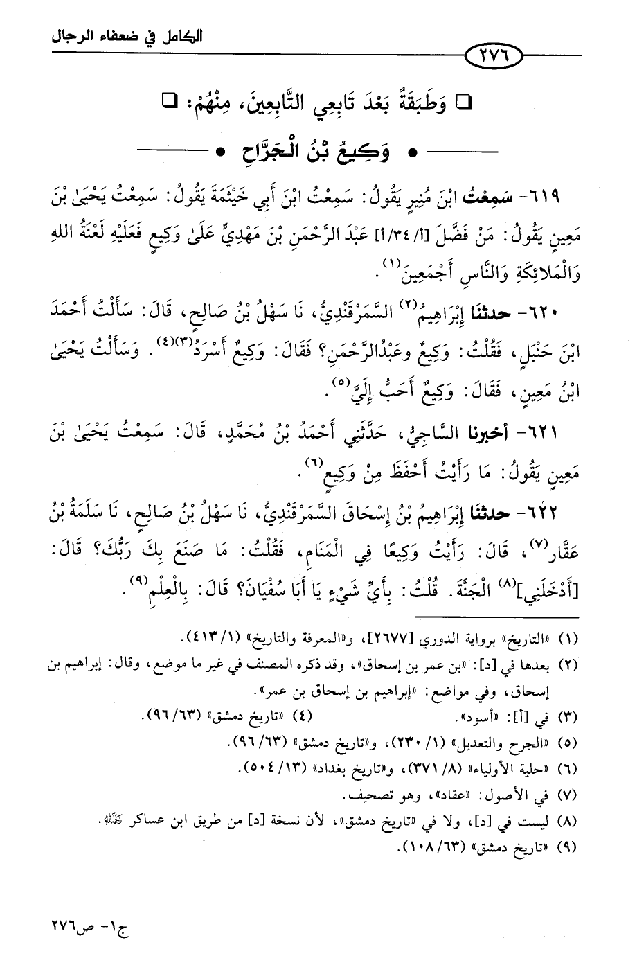 619 - سمعت ابن منير يقول: سَمعتُ ابن أبي خيثمة يقول: سَمعتُ يَحيى بن مَعين يقول: مَن فضَّل عَبد الرحمن بن مهدي على وكيع فعليه لعنة الله والملائكة والناس أجمعين.