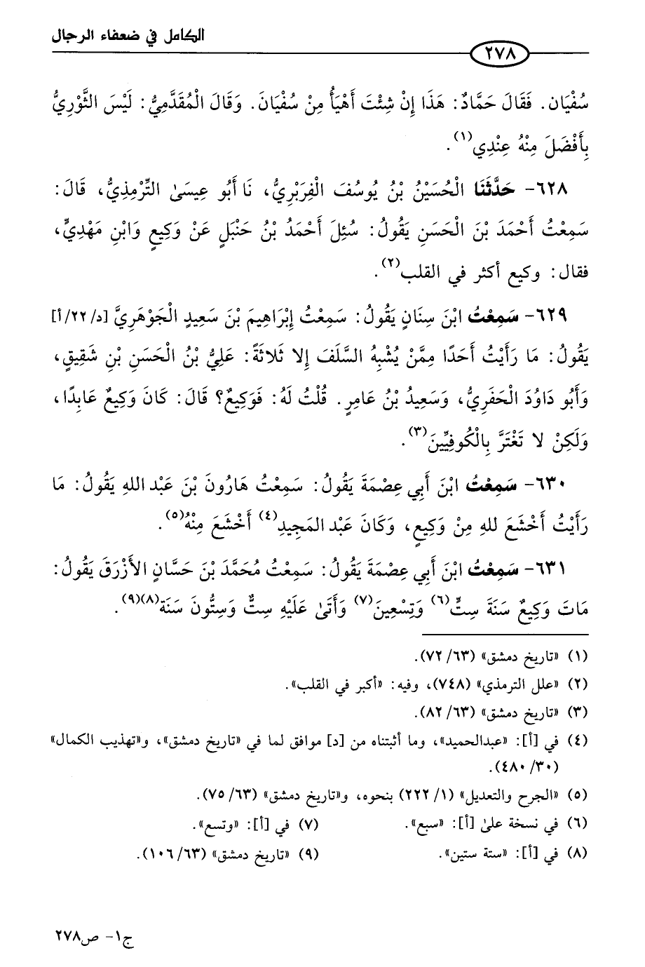 628 - حَدثنا الحسين بن يوسف الفربري، حدثنا أَبو عيسى التِّرمِذِي، قال: سمعتُ أحمد بن الحسن يقول: سئل أحمد بن حنبل عن وكيع، وابن مهدي، فقال: وكيع أكثر في القلب.