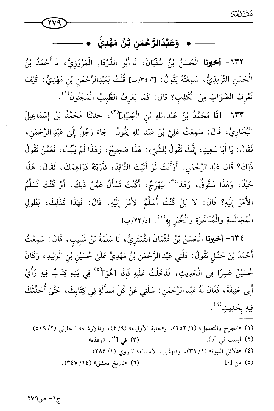 633 - حَدثنا مُحمد بن عَبد الله بن الجنيد، حدثنا مُحمد بن إسماعيل البُخاري، قال: سمعتُ علي بن عَبد الله يقول: جاء رجل إلى عَبد الرحمن، فقال: يا أبا سعيد إنك تقول للشيء هذا صحيح وهذا لم يثبت، فعمن تقول ذلك؟ قال عَبد الرحمن: أرأيت لو أتيت الناقد فأريته دراهمك فقال: هذا جيد وهذا ستوق وهذه نبهرج، أكنت تسأل عمن ذلك، أو كنت تسلم الأمر إليه؟ قال: لاَ، بل كنت أسلم الأمر إليه، قال: فهذا كذلك لطول المجالسة والمناظرة والخُبْر به.
