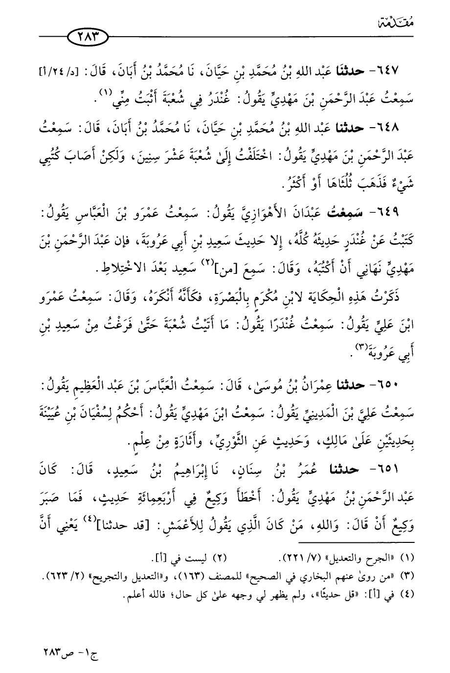 650 - حَدثنا عمران بن موسى، قال: سمعتُ العباس بن عَبد العظيم يقول: سَمعتُ علي بن المديني يقول: سَمعتُ ابن مهدي يقول: أحكم لسفيان بن عُيَينة بحديثين على مالك، وحديث عن الثَّوري، وأثارة من علم.