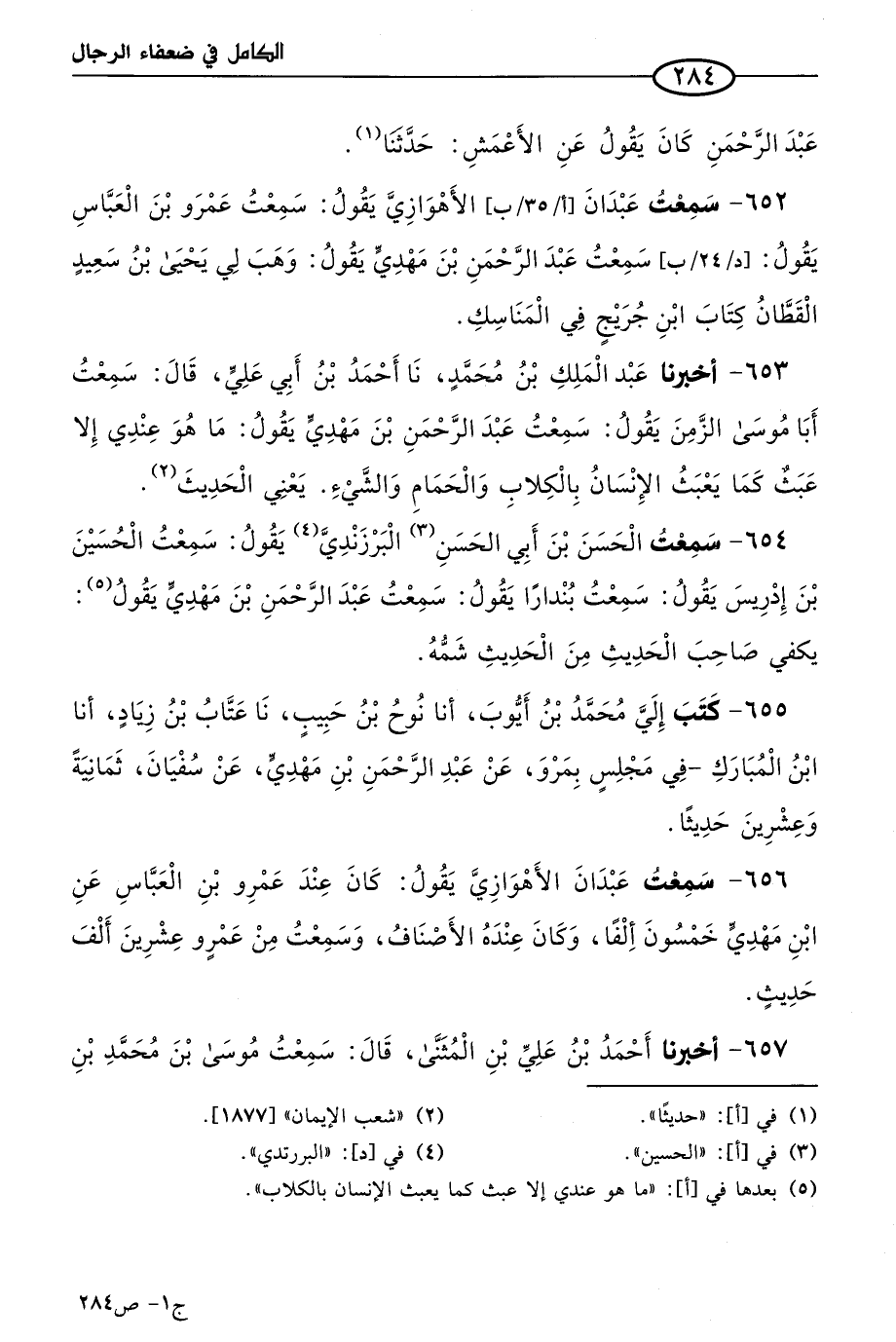 653 - أخبرنا عَبد الملك بن مُحمد، حدثنا أحمد بن أبي علي، قال: سمعتُ أبا موسى الزمن يقول: سَمعتُ عَبد الرحمن بن مهدي يقول: ما هو عندي إلا عبث كما يعبث الإنسان بالكلاب والحمام والشيء، يعني الحديث.