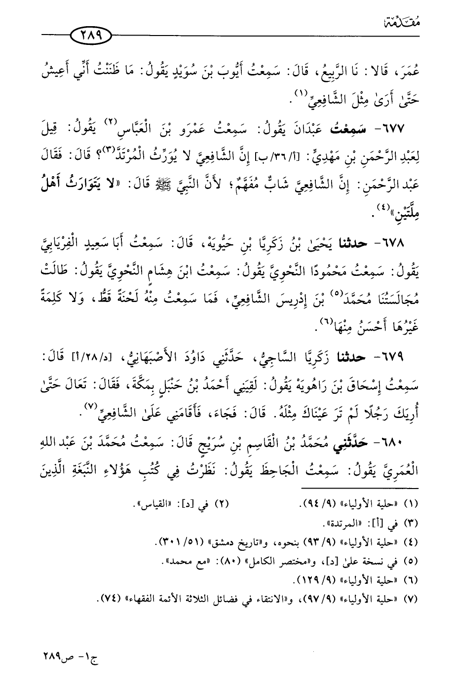678 - حَدثنا يَحيى بن زكريا بن حيويه، قال: سمعتُ أبا سعيد الفريابي يقول: سَمعتُ محمودا النحوي يقول: سَمعتُ ابن هشام النحوي يقول: طالت مجالستنا مُحمد بن إدريس الشافعي فما سمعت منه لحنة قط، ولا كلمة غيرها أحسن منها.