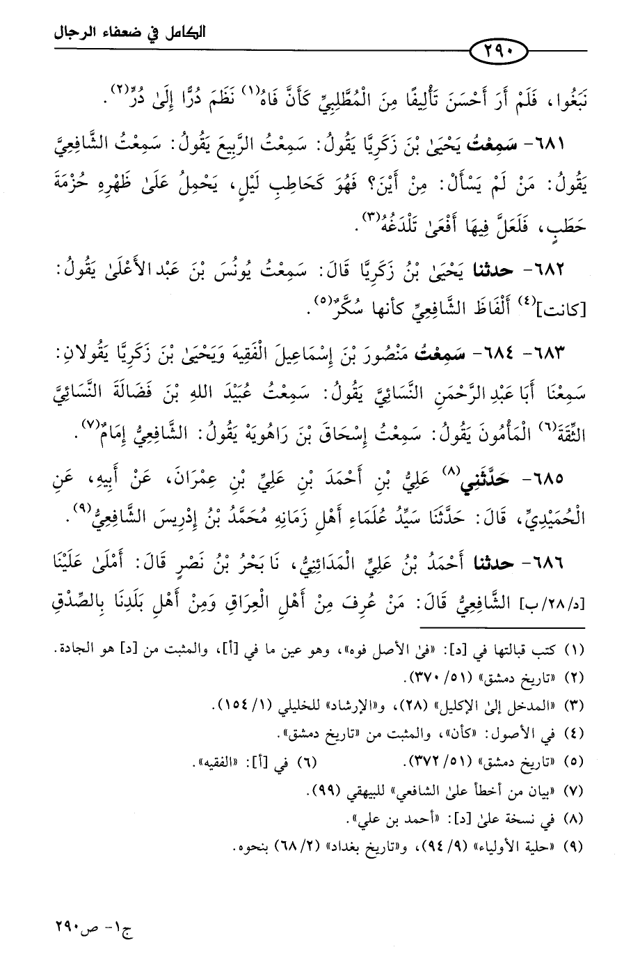 683 - 684 - سمعتُ منصور بن إسماعيل الفقيه، ويحيى بن زكريا، يقولان: سمعنا أبا عَبد الرحمن النسائي يقول: سَمعتُ عُبيد الله بن فضالة النسائي الثقة المأمون يقول: سَمعتُ إسحاق بن راهويه يقول: الشافعي إمام.