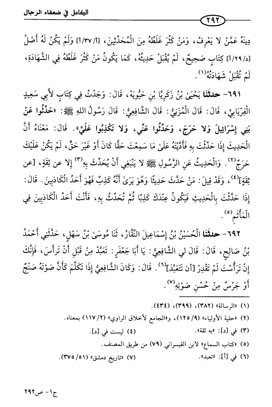 691 - حَدثنا يَحيى بن زكريا بن حيويه قال: وجدت في كتابٍ لأبي سعيد الفريابي، قال: قال المزني: قال الشافعي: قال رسول الله صَلى الله عَليه وسَلم: حدثوا عن بني إسرائيل ولا حرج، وحدثوا عني ولا تكذبوا عليَّ.