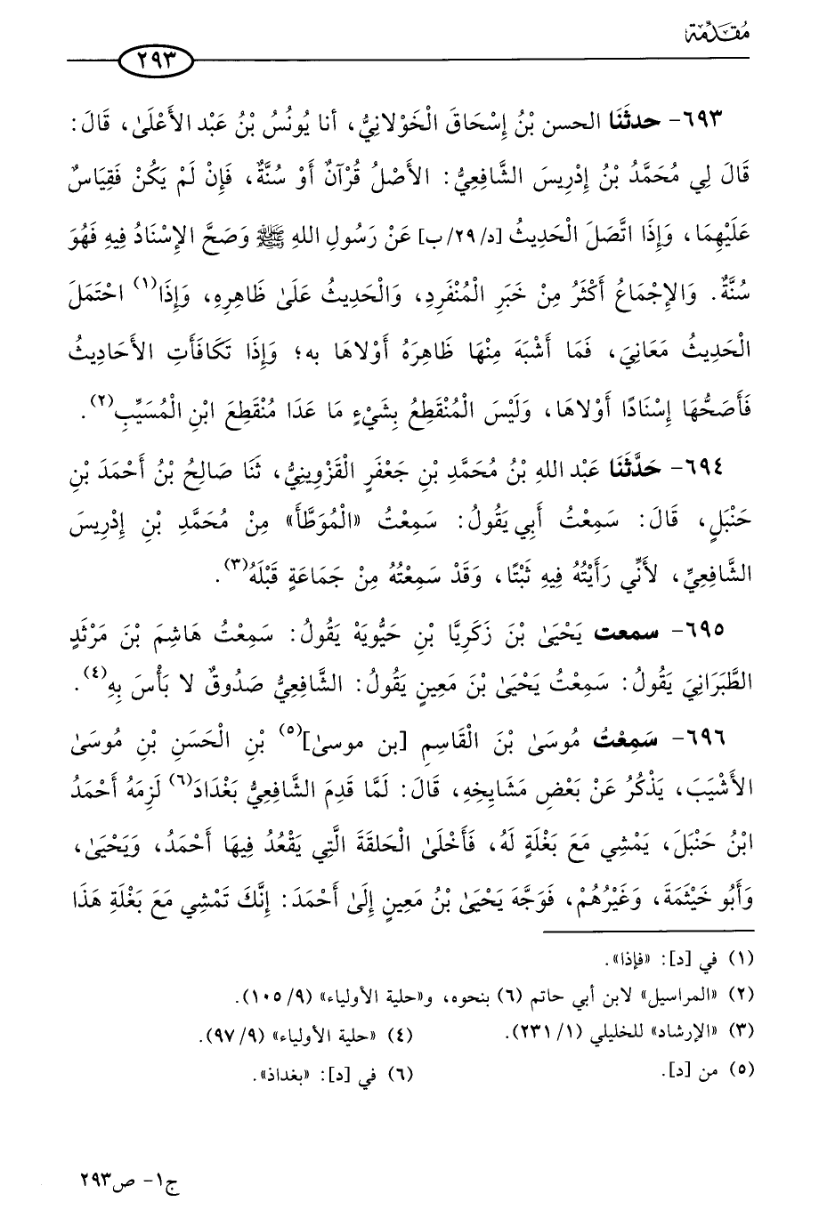 695 - سمعتُ يَحيى بن زكريا بن حيويه يقول: سَمعتُ هاشم بن مرثد الطبراني يقول: سَمعتُ يَحيى بن مَعين يقول: الشافعي صدوق لا بأس به.