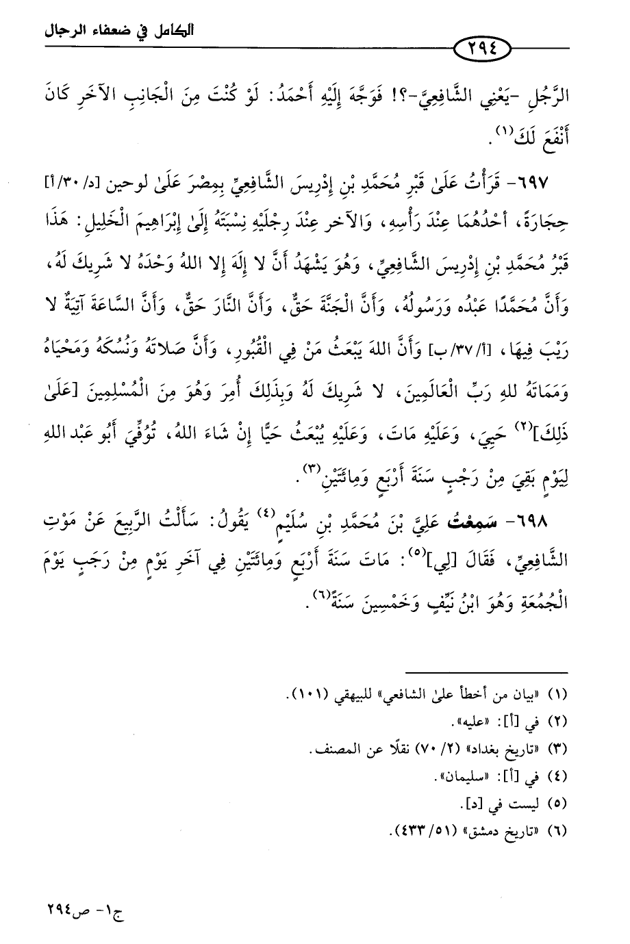 698 - سمعتُ علي بن مُحمد بن سليم يقولُ: سَألتُ الربيع عن موت الشافعي؟ فقال لي: مات سنة أربع ومِئَتَين في آخر يوم من رجب يوم الجمعة، وهو ابن نيف وخمسين سنة.