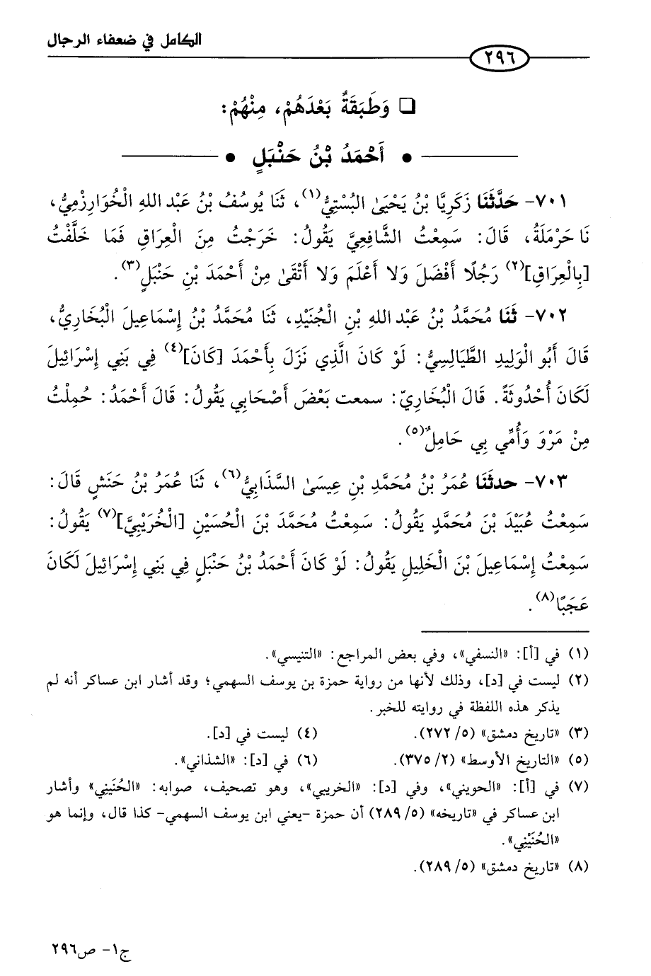 701 - حَدثنا زكريا بن يَحيى البستي، حَدثنا يوسف بن عَبد الله الخوارزمي، حدثنا حرملة، قال: سمعتُ الشافعي يقول: خرجت من العراق فما خلفت بالعراق رجلاً أفضل، ولا أعلم، ولا أتقى من أحمد بن حنبل.