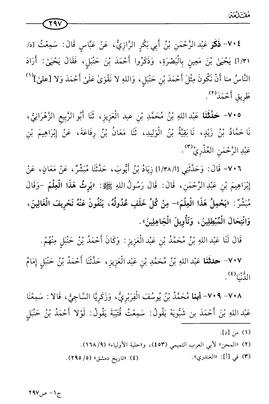 706 - قال: وحدثني زياد بن أيوب، حَدثنا مبشر، عن مُعَان، عن إبراهيم بن عَبد الرحمن، قال: قال رسول الله صَلى الله عَليه وسَلم: يرث هذا العلم، وقال مبشر: يحمل هذا العلم، مِن كل خلفٍ عُدوله، ينفون عنه تحريف الغالين وانتحال المبطلين وتأويل الجاهلين.