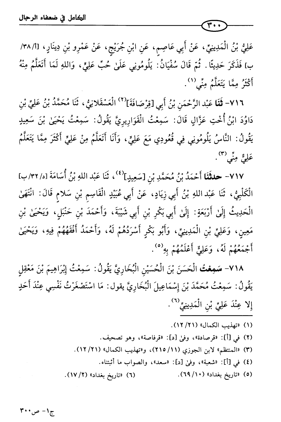 718 - سمعتُ الحسن بن الحسين البُخاري يقول: سَمعتُ إبراهيم بن معقل يقول: سَمعتُ مُحمد بن إسماعيل البُخاري يقول: ما استصغرت نفسي عند أحد إلا عند علي بن المديني.